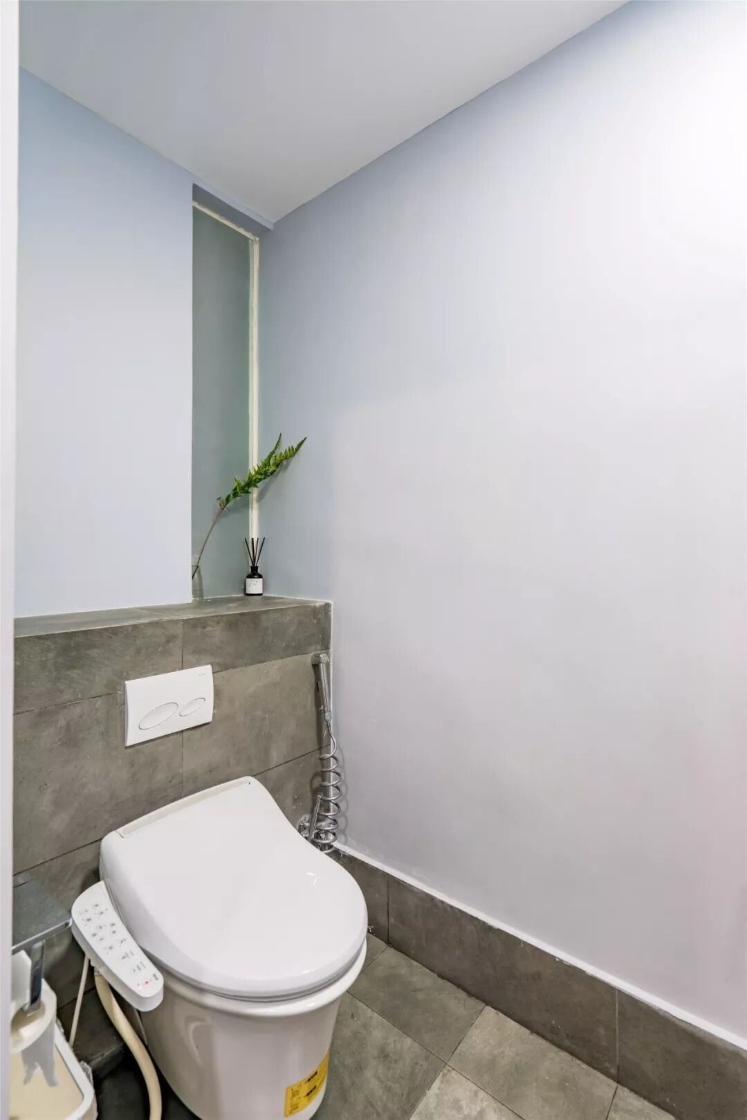 ▲马桶装了墙排式的,抽水箱用瓷砖封了起来,整体入墙的设计还多出了一个置物台,简洁实用而美观。