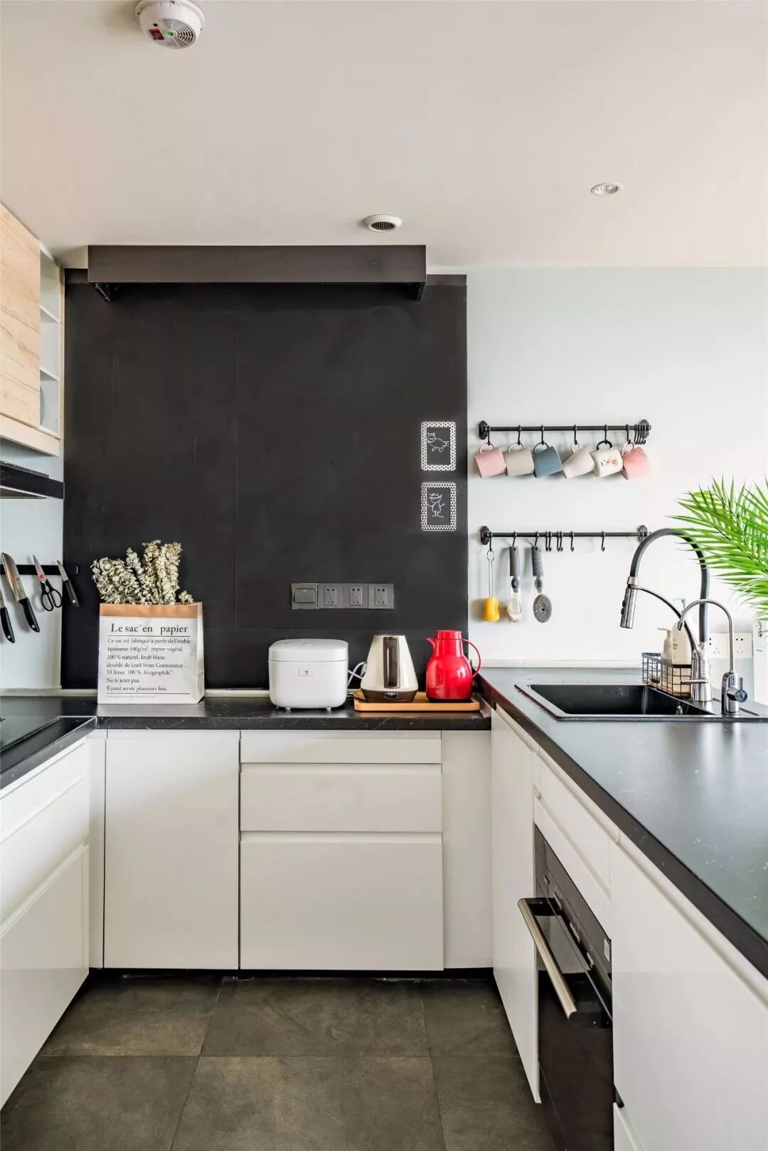 ▲黑板墙旁的墙面挂杆,挂上各色的杯具,还有颜色鲜艳的水壶,为使得空间充满档次的雅致感。