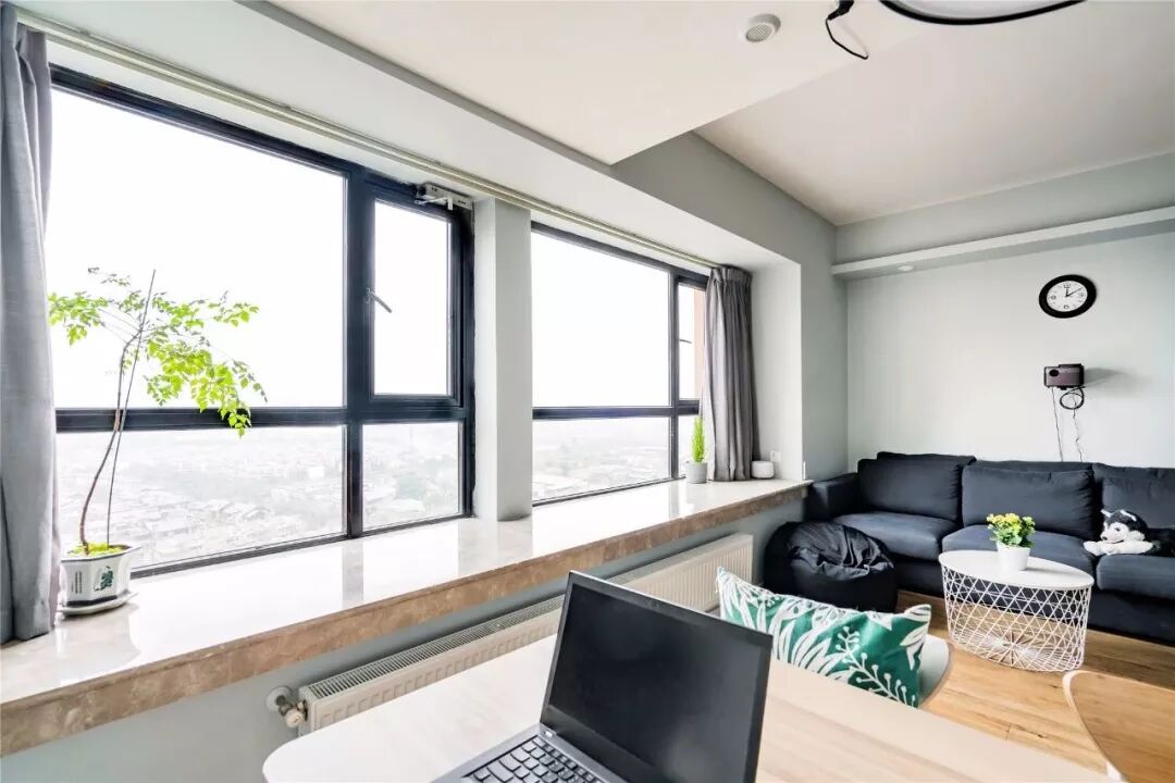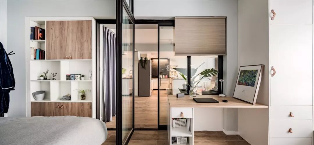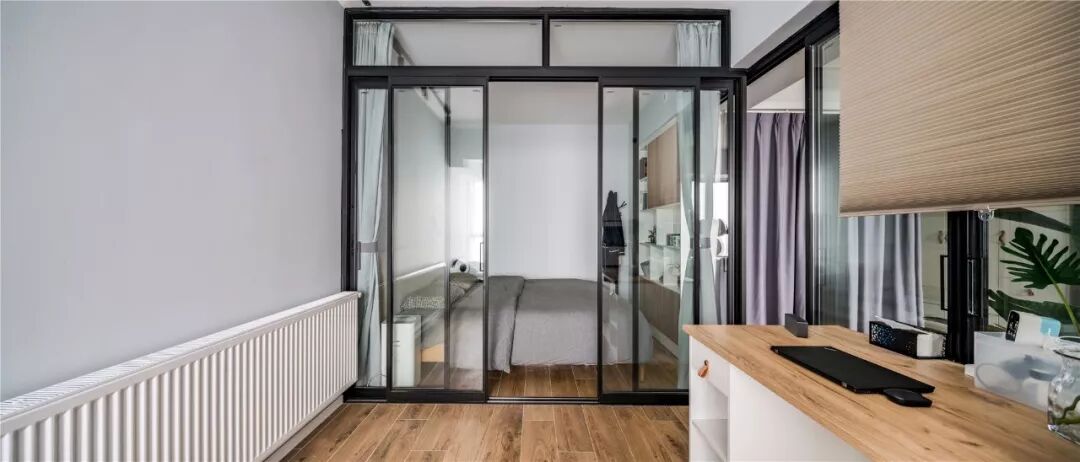▲卧室与办公区以落地推拉门+窗帘相隔,平时开阔的视觉,让小户型空间也更加大气。