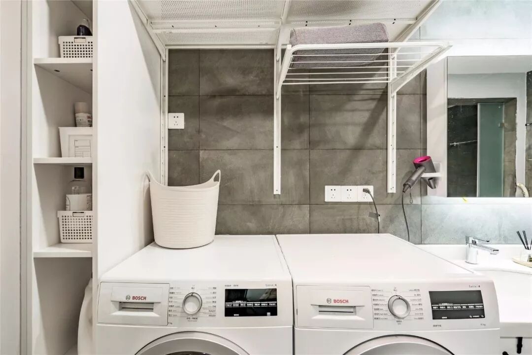 ▲洗衣机上方是置衣架,左侧是收纳格,整个空间都文艺优雅好实用。