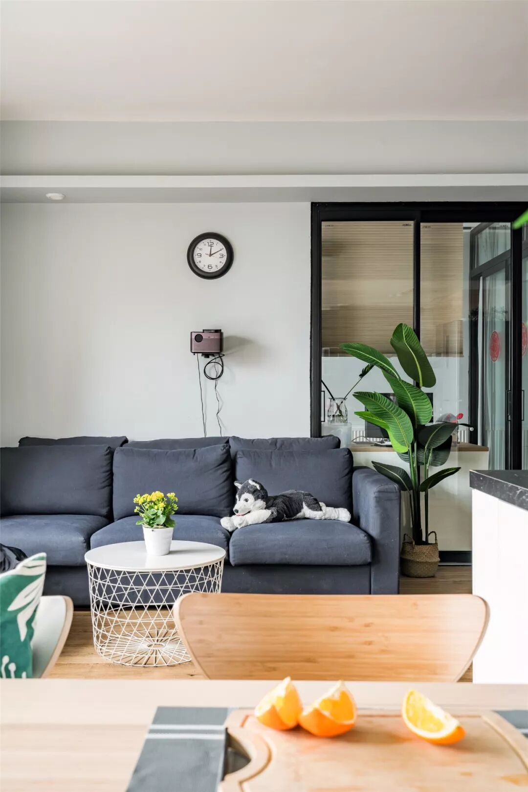 ▲沙发墙留白的基础布置上投影仪与一个时钟,搭配灰色布艺沙发与白色大理石质感的圆形茶几,一旁还有芭蕉叶绿植,令人简约清新好舒适。
