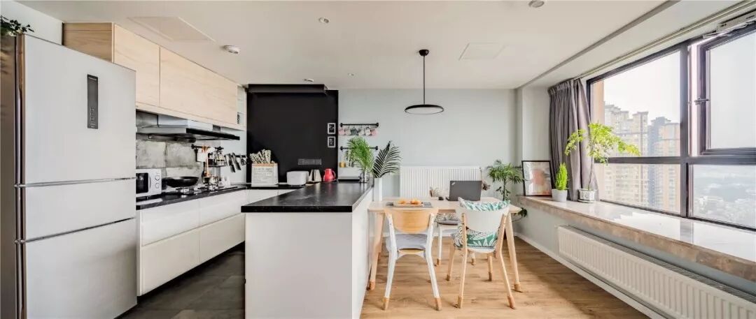 ▲餐厅厨房开放式的格局隔着一张中岛台,木质的餐桌椅布置,餐桌后方的暖气片直接裸装,在淡绿色墙面背景下,结合旁边的盆栽,显得清新自然好舒适。