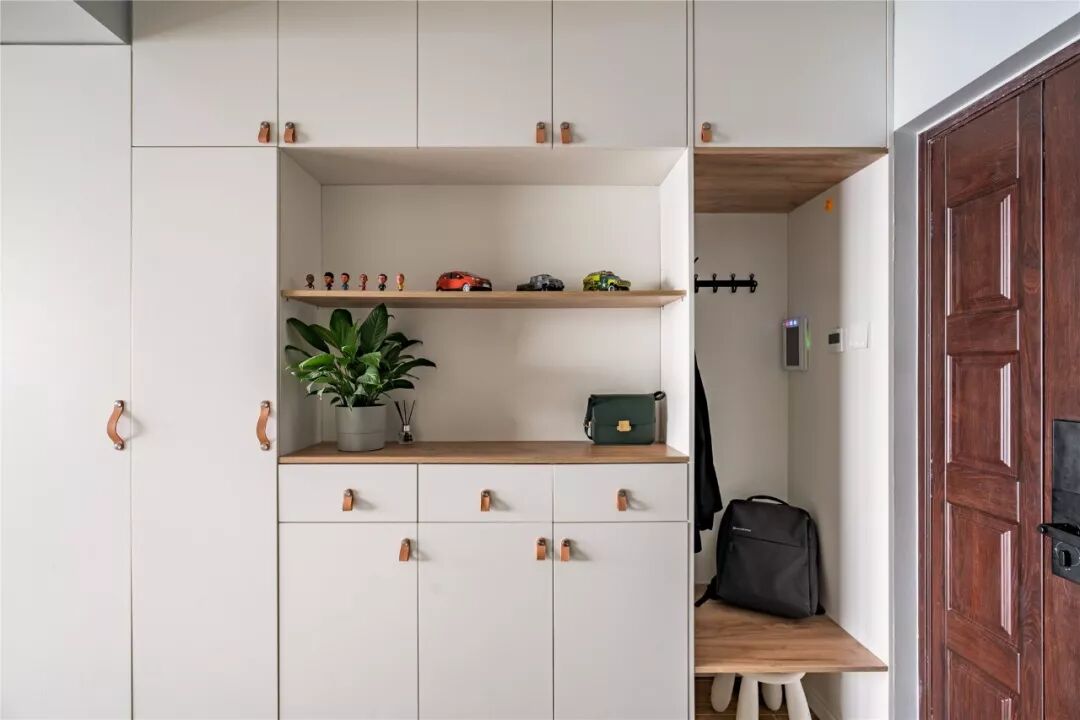 ▲换鞋凳嵌入到鞋柜里,挂钩与隔板架,让玄关也显得精致优雅好大气。