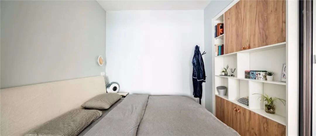 ▲卧室面积较小,布置上床后留出的空间不多,床尾一个展示架+收纳柜组合的布置,白色空间布置上绿植摆饰,搭配木色柜门,简约自然的空间在床尾还放了一个挂衣架,临时换下的衣物都可以挂上去。