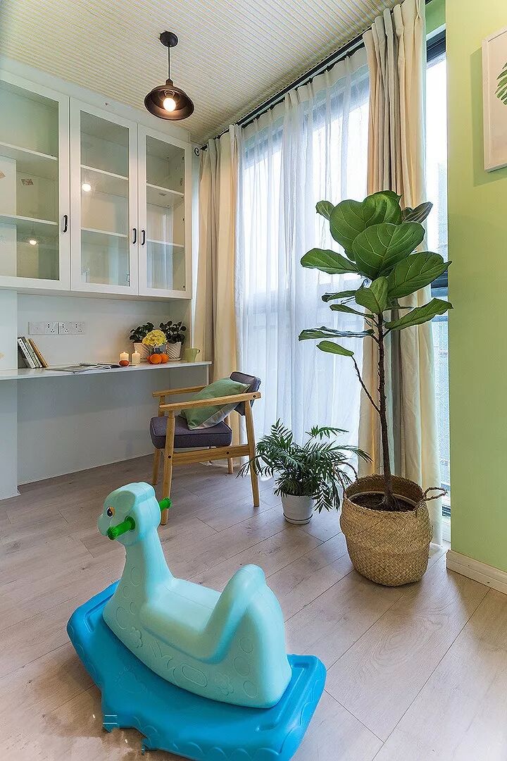 很多房子里都没有一个独立的书房,那么你就可以考虑把阳台包进客厅,利用阳台来做一个书房了。用玻璃门或者窗帘封闭起来,在阳台一侧做简单的入墙书柜和书桌,变身简易实用的小书房。