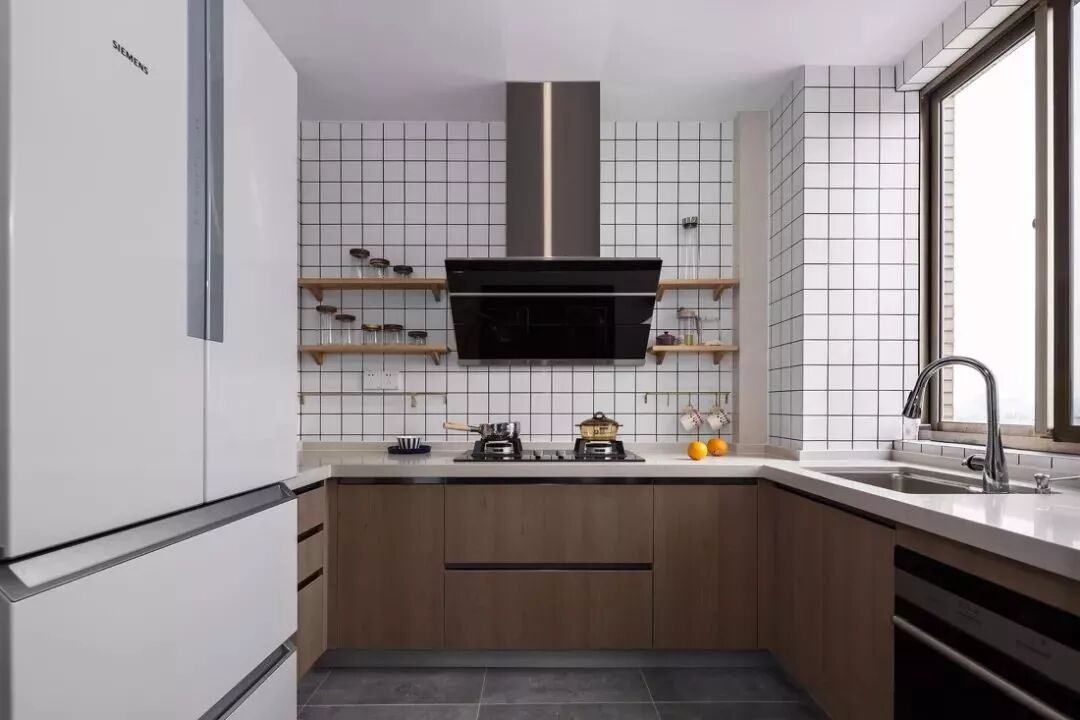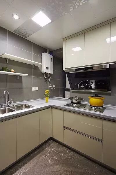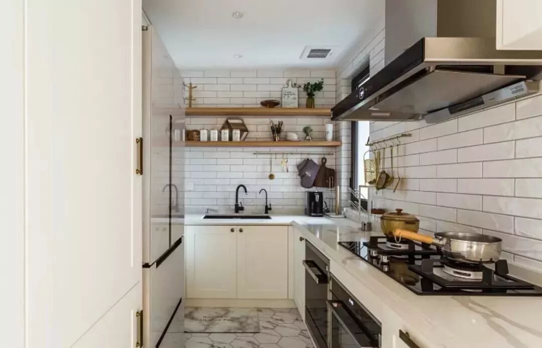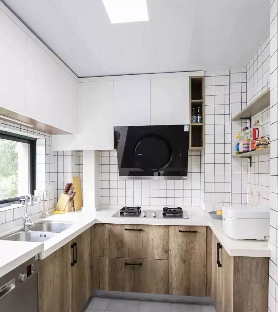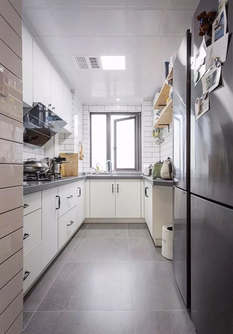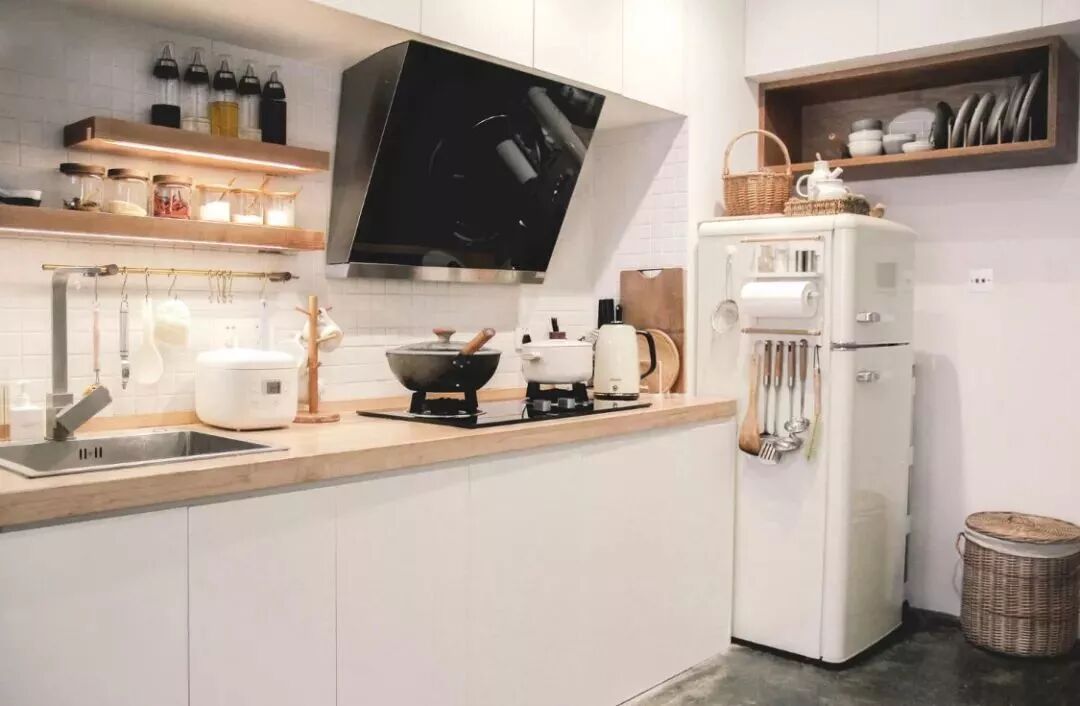 相对而言,装层板的造价要比做吊柜便宜很多,如果厨房里面有较多常用的调味料等瓶瓶罐罐的,那么做几个层板真的是会实用很多!你看这样设计的厨房,实用吗?