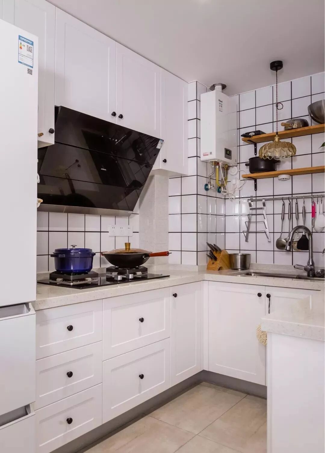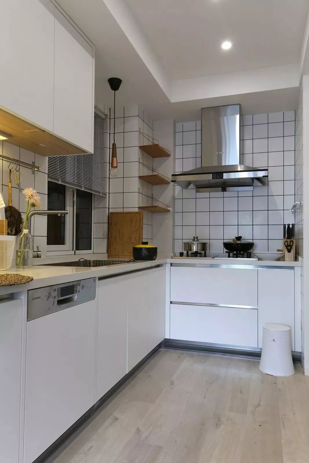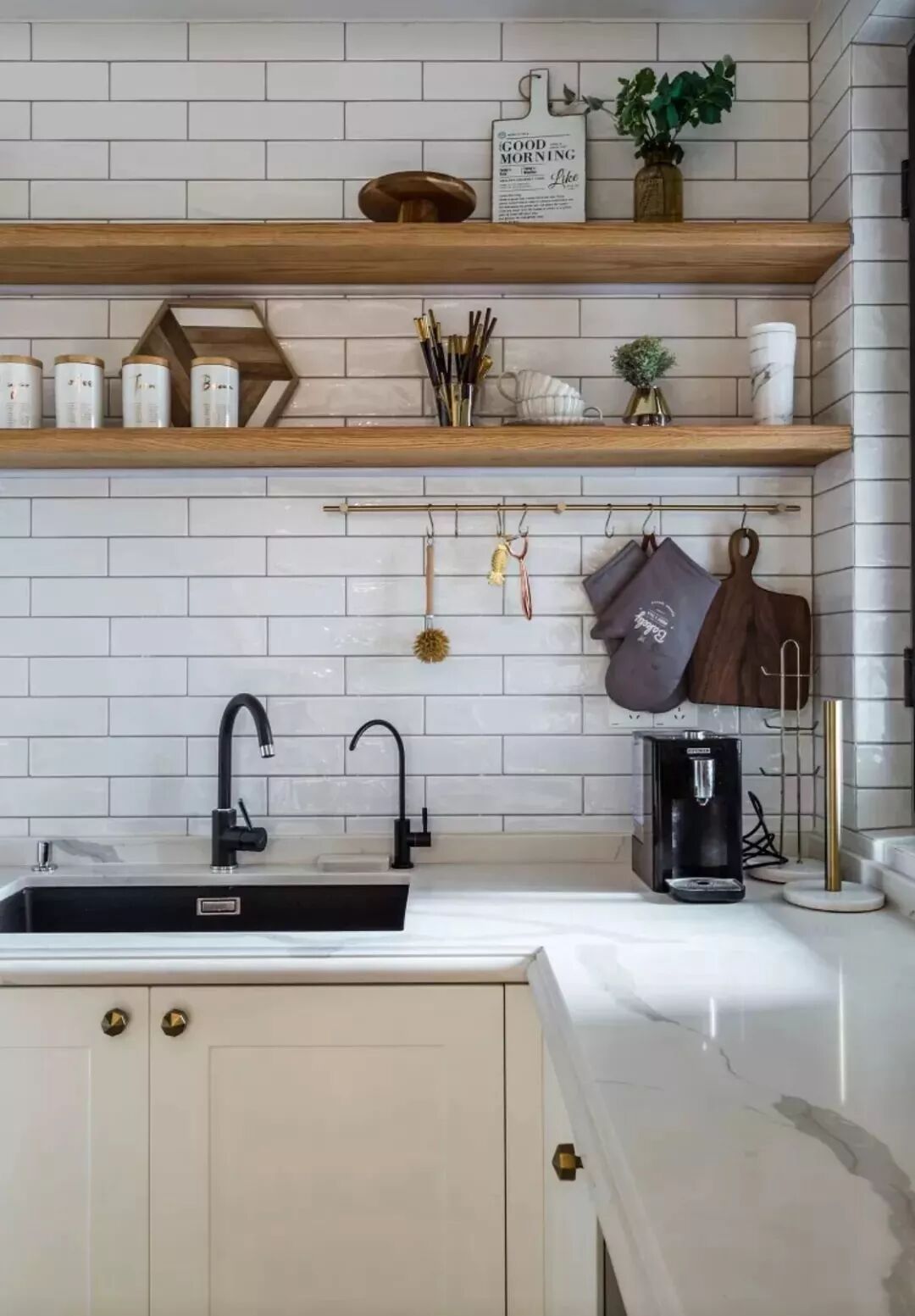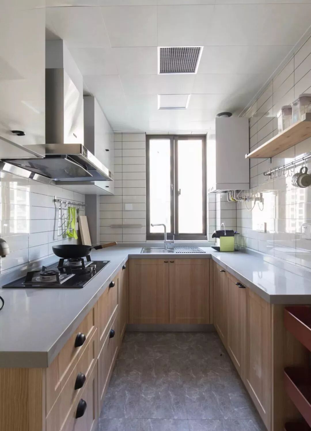 相对而言,装层板的造价要比做吊柜便宜很多,如果厨房里面有较多常用的调味料等瓶瓶罐罐的,那么做几个层板真的是会实用很多!你看这样设计的厨房,实用吗?