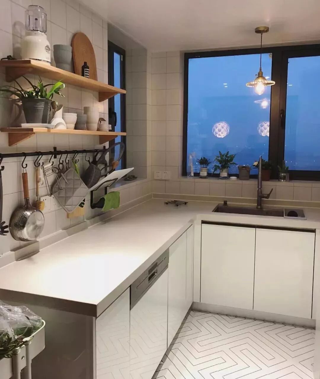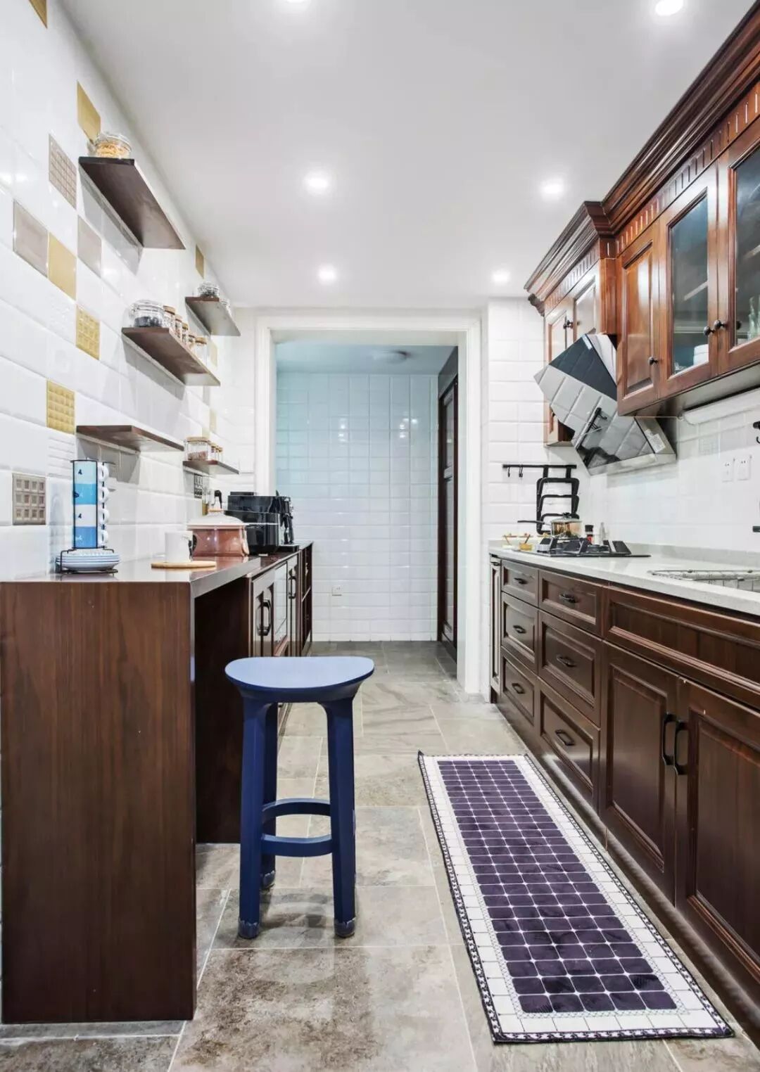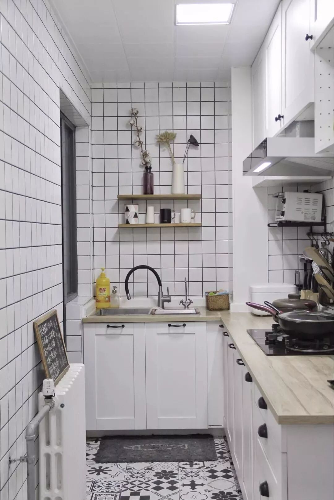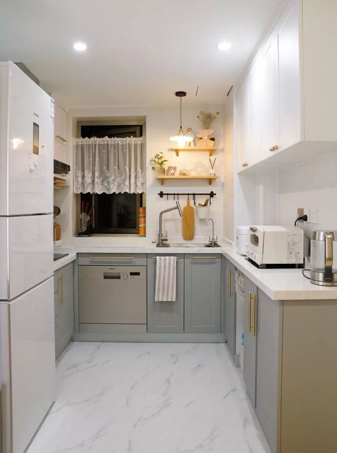 相对而言,装层板的造价要比做吊柜便宜很多,如果厨房里面有较多常用的调味料等瓶瓶罐罐的,那么做几个层板真的是会实用很多!你看这样设计的厨房,实用吗?