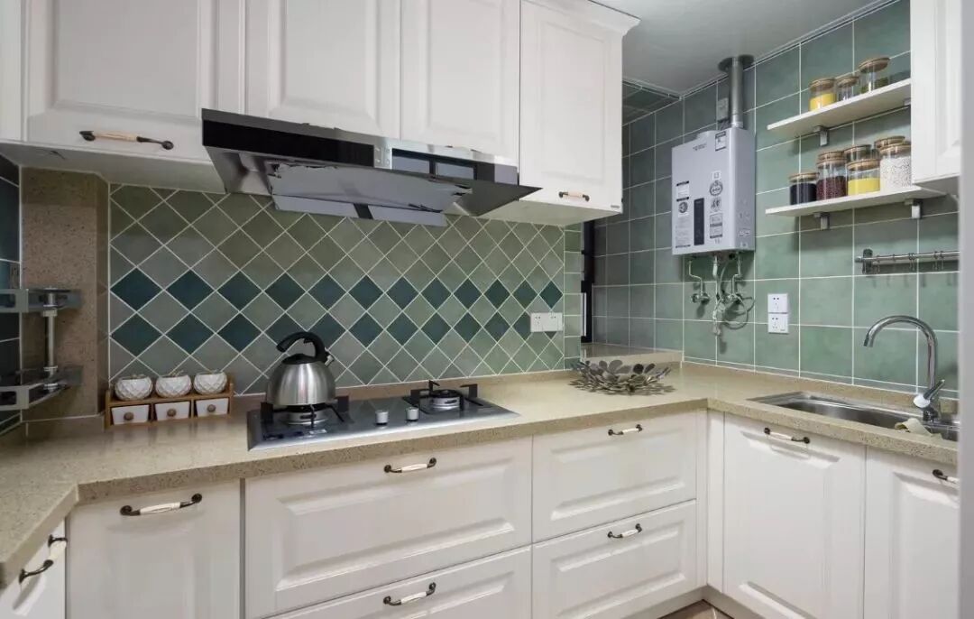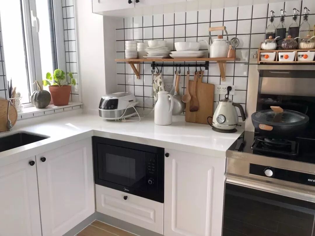 为了使厨房用起来更加方便实用,在原本面积就较小的空间下,可以考虑从立面空间利用出发,在墙面上安装搁板层,这样常用的厨房用品就可以往上面摆放,要用的时候也无需去开启柜门翻找,非常方便。