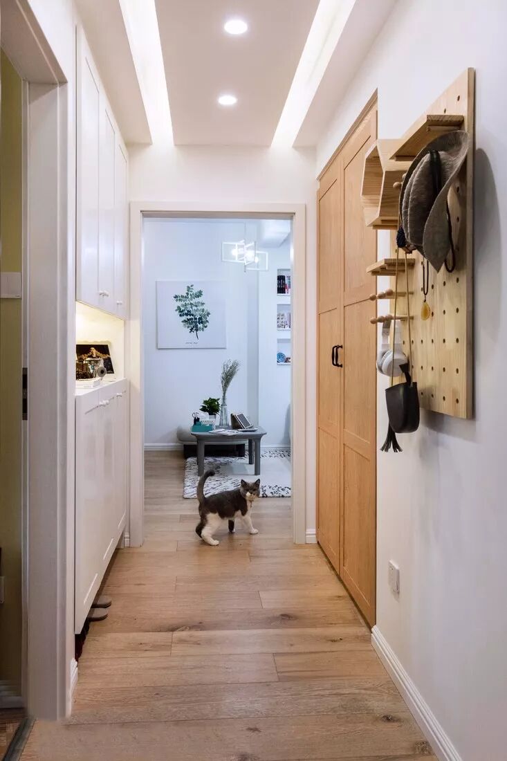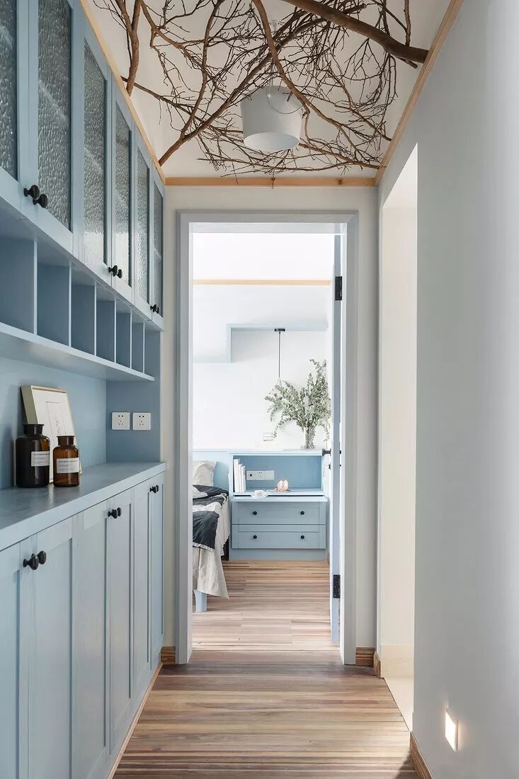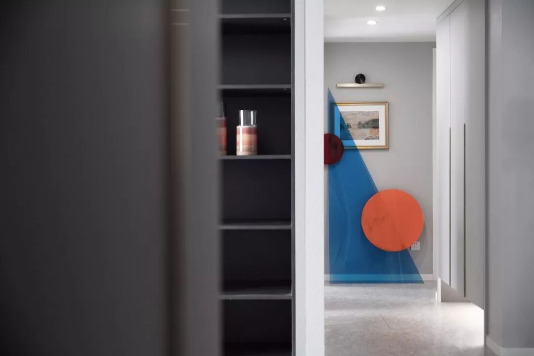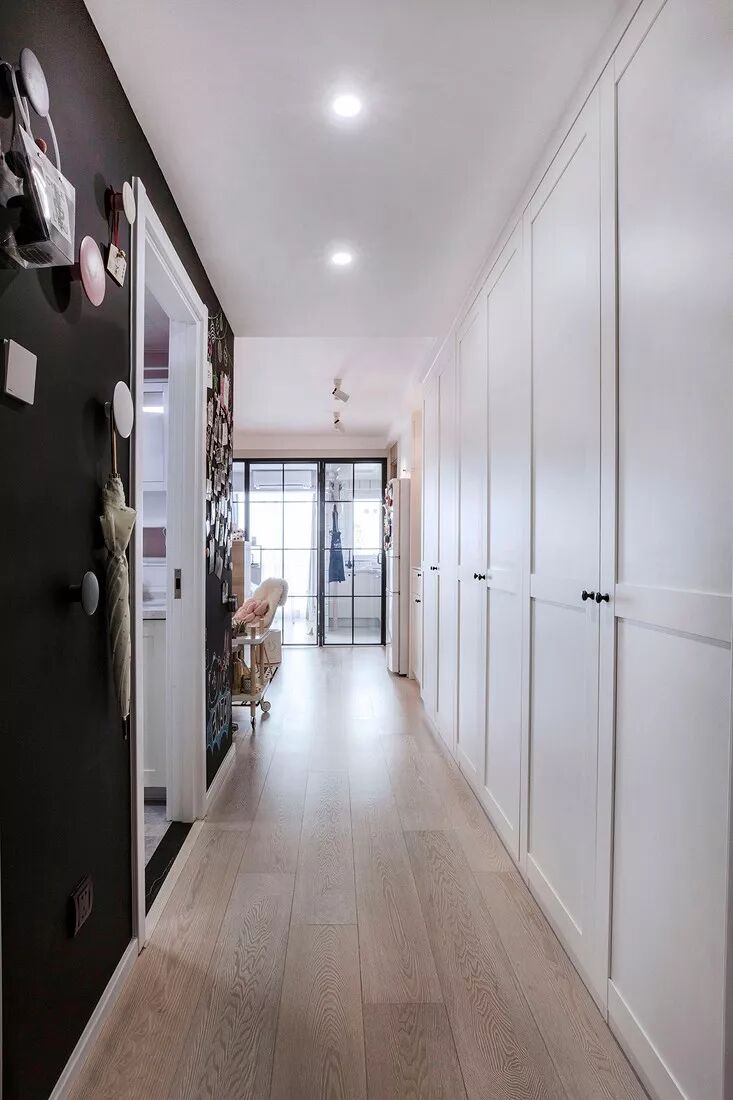 为走廊过道量身定做的柜子,隐藏着巨大的收纳空间,全部采用将内部封闭起来的柜门设计,从而保持走廊整洁的观感,空出的柜面上,还可以添置些装饰物。