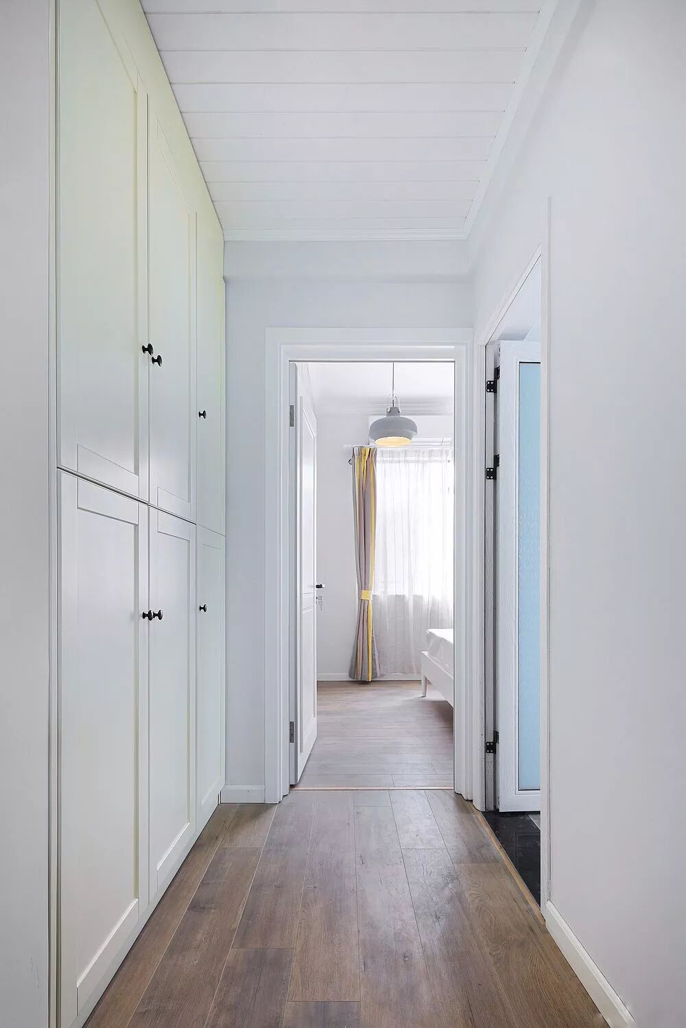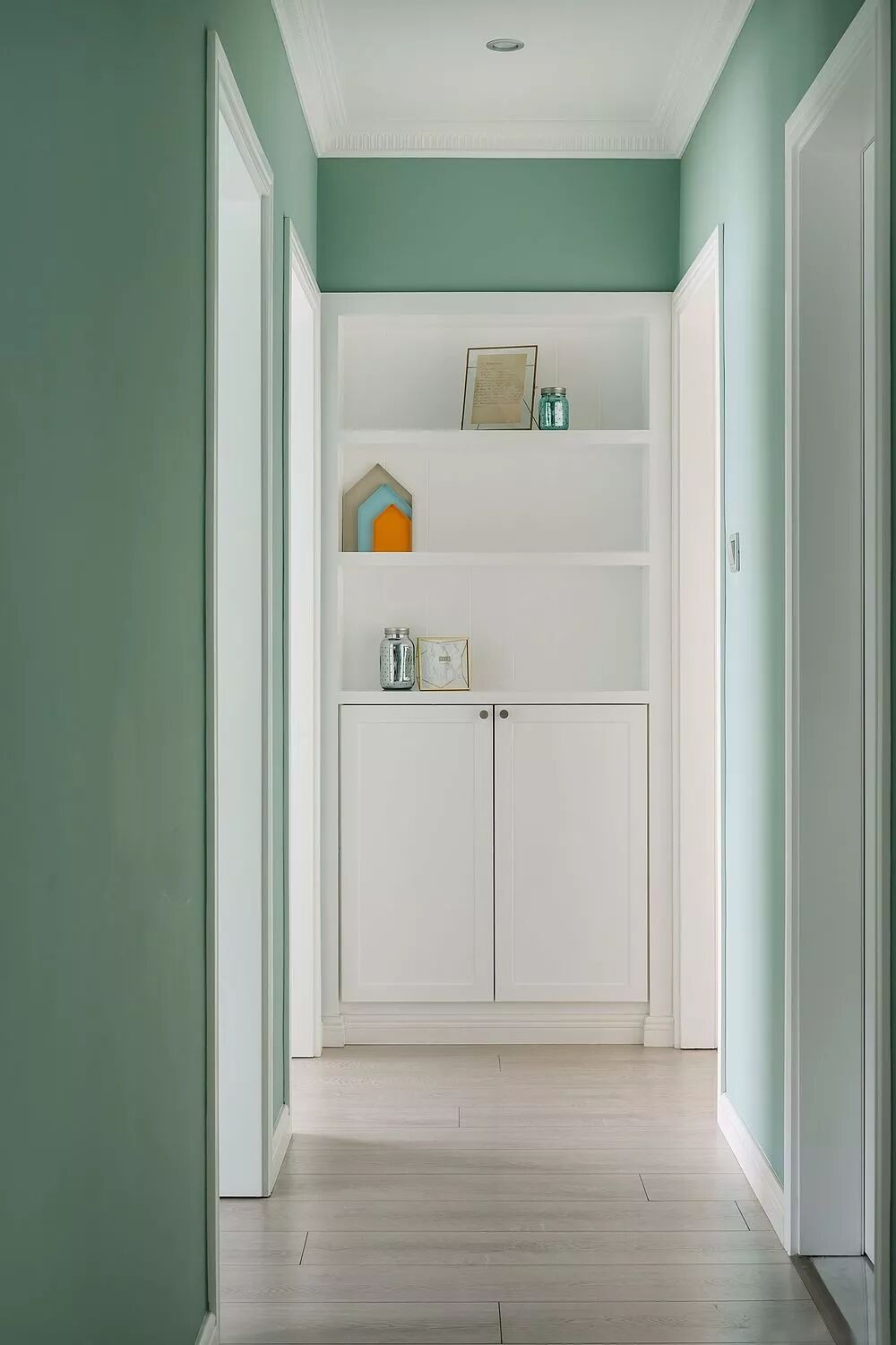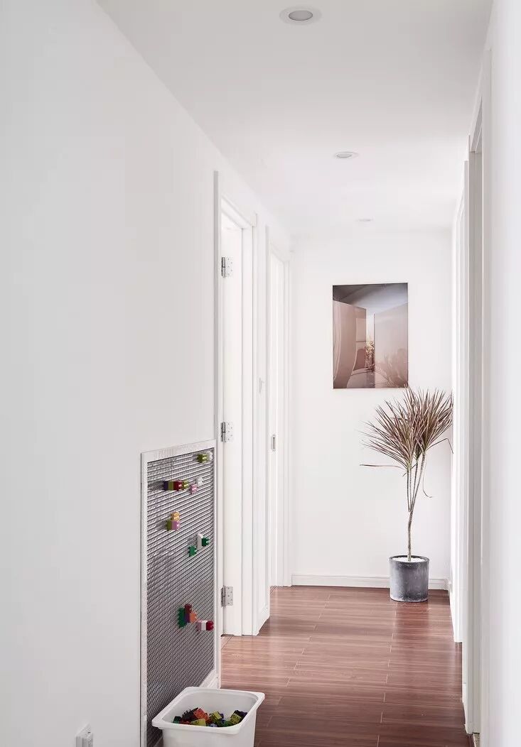 为走廊过道量身定做的柜子,隐藏着巨大的收纳空间,全部采用将内部封闭起来的柜门设计,从而保持走廊整洁的观感,空出的柜面上,还可以添置些装饰物。