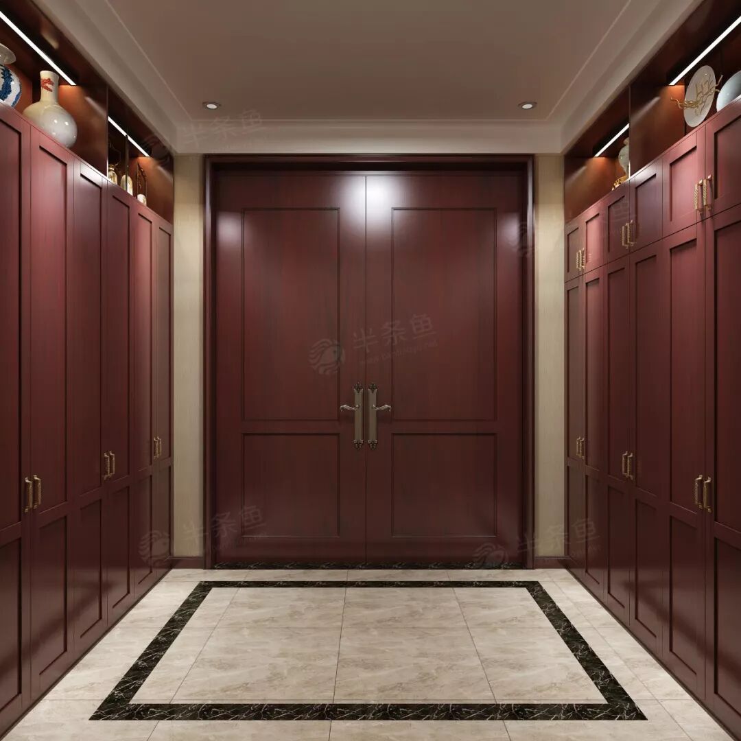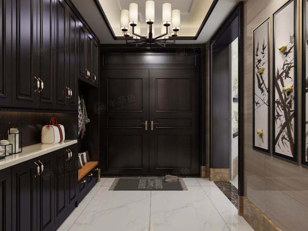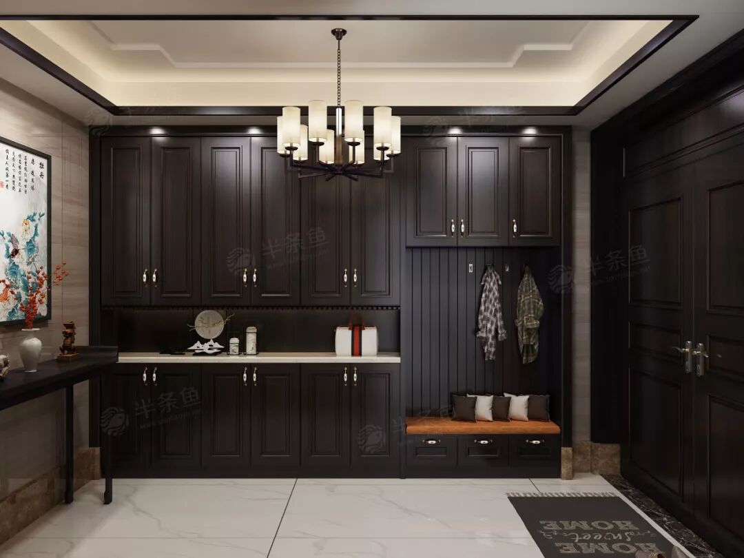 以红色为基调之后,这套设计将以黑白灰为主。入室门厅挂有山水画或一组好书法,文人墨客也能拜读一番。功能性鞋柜让换鞋穿衣更加方便,对于物品的储蓄也是相当之大。
