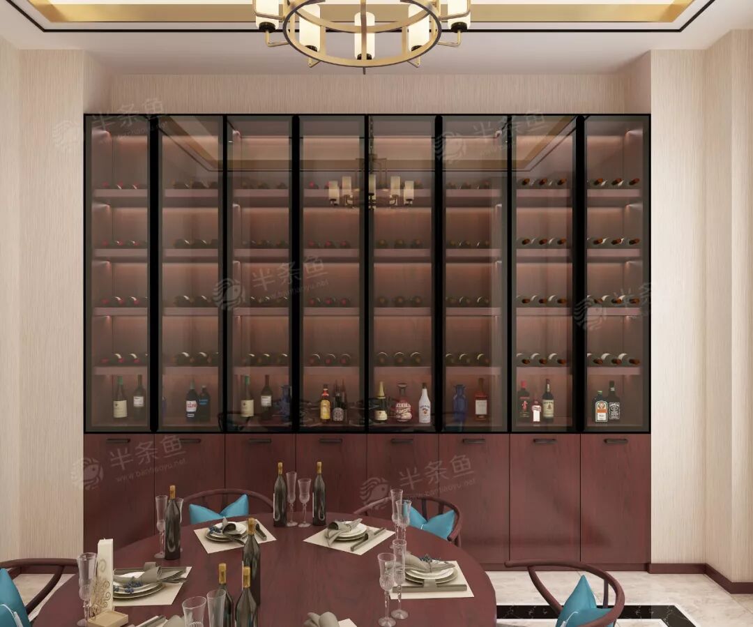 新中式造型没有过多的繁复,酒柜外观也更加精美简单。黑框玻璃门内木作隔板很好的保护的酒的储蓄,高度不同的区域对于各种酒品都能收入囊中。