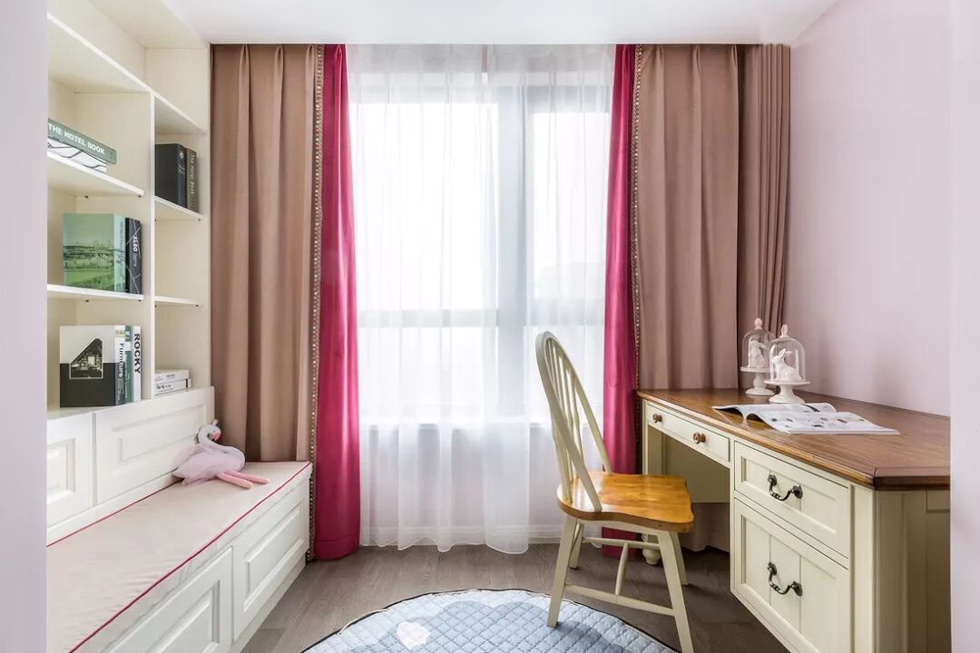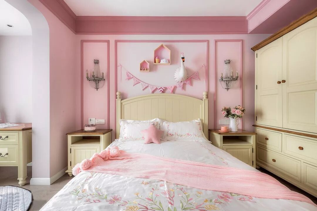 ▲ 粉嫩嫩的儿童房,小姑娘一定会爱上的梦幻系。床品选择了浅色系,增添清新的味道。房间内设计了大面积的柜体,满足小姑娘的衣物收纳需求。
