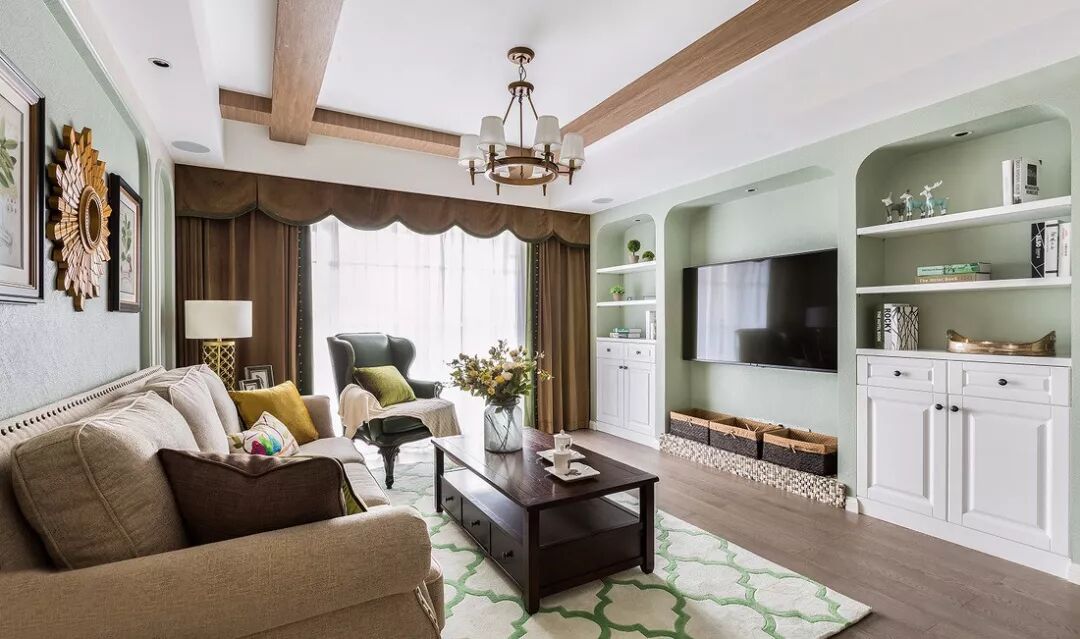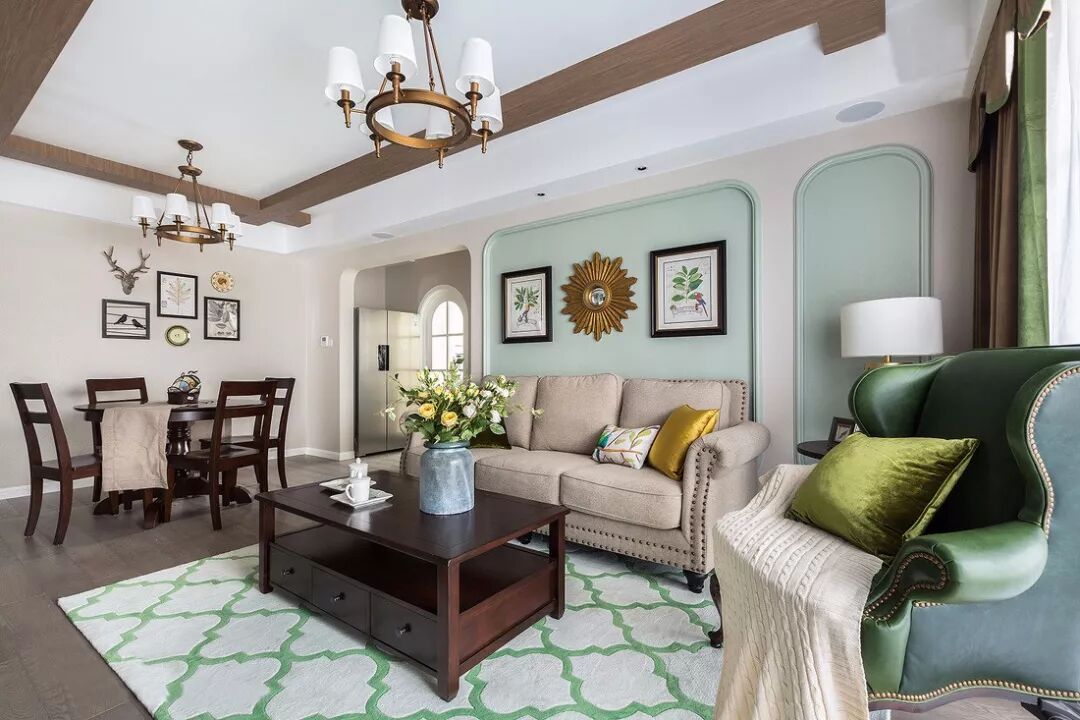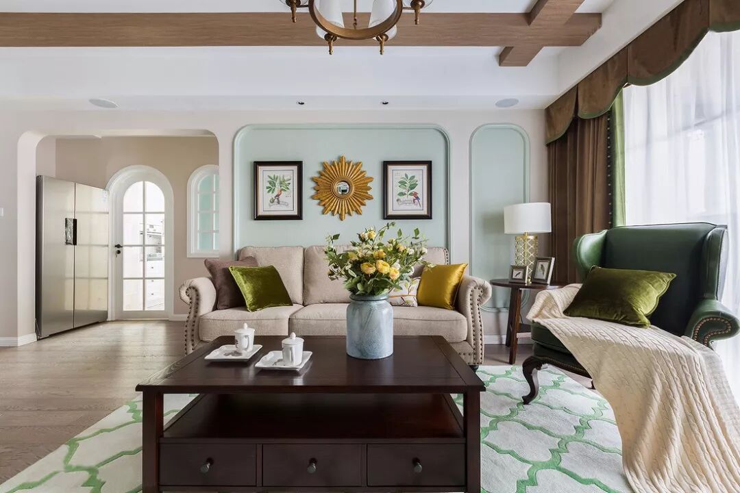 ▲ 客厅以薄荷绿与米色为主色调,柔和中带来些些清凉,薄荷绿的墙面搭配卡其色的布艺沙发,清新自然。墨绿色单人沙发临窗而立,优雅复古而不失品质感。