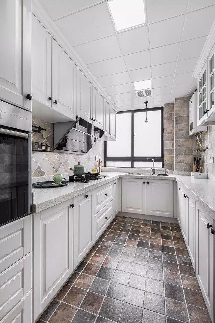 ▲ 厨房干净整洁,空间收纳井井有条,墙地面使用仿古砖,把厨房铺出个性化的效果。