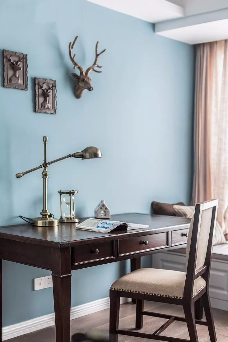 ▲ 蓝色的书房安静简洁,有助于集中精力。飘窗榻榻米的设计留出一方静谧,便于久读后休憩,享受闲适与自然。