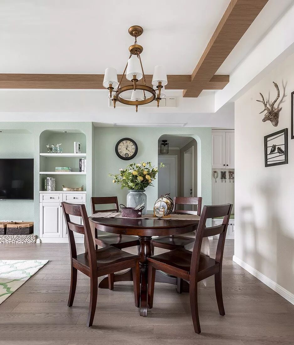 ▲ 复古木质圆桌典雅有格调,桌上放置一盆花卉,使餐厅生机盎然,让人感到舒心。