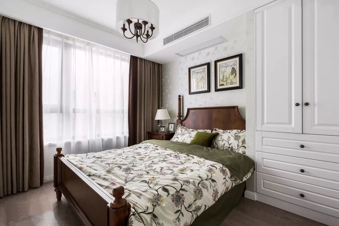 ▲ 次卧则是选择了棕色的美式家具、绿色的床品、卡其色搭配白纱的窗帘,走的还是清爽和温暖路线。