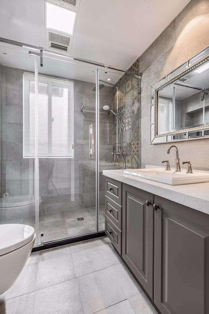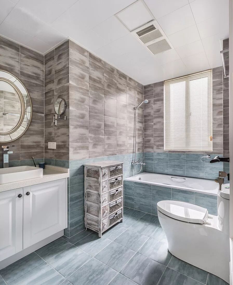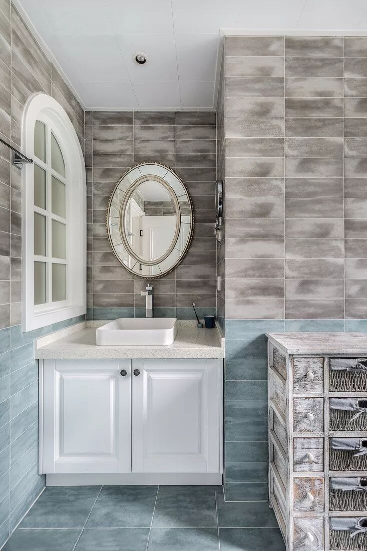 ▲ 主卫设置了淋浴隔断,灰色的卫浴柜搭配白色的台面,低调简洁。次卫采用蓝灰色的仿古砖结合,呈现出舒适的色调以及独具风格的空间感觉。