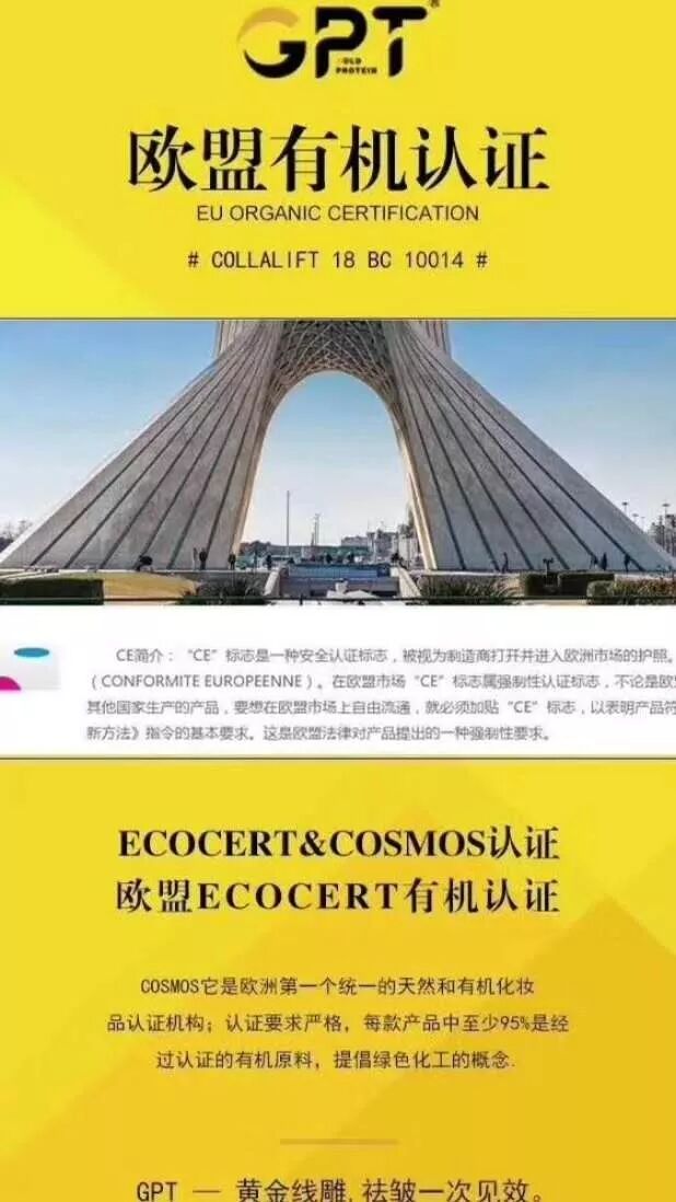 不开刀埋线,无仪器导入,全球首创涂抹式祛皱,5分钟见效!与福布斯排行榜112位的德国 巴斯夫强强合作,李湘代言,昕薇杂志力推,各大卫视播出,各大影院投放,欧盟有机认证,核心专利成分,食品药品监督局备案,中国人民保险投保……