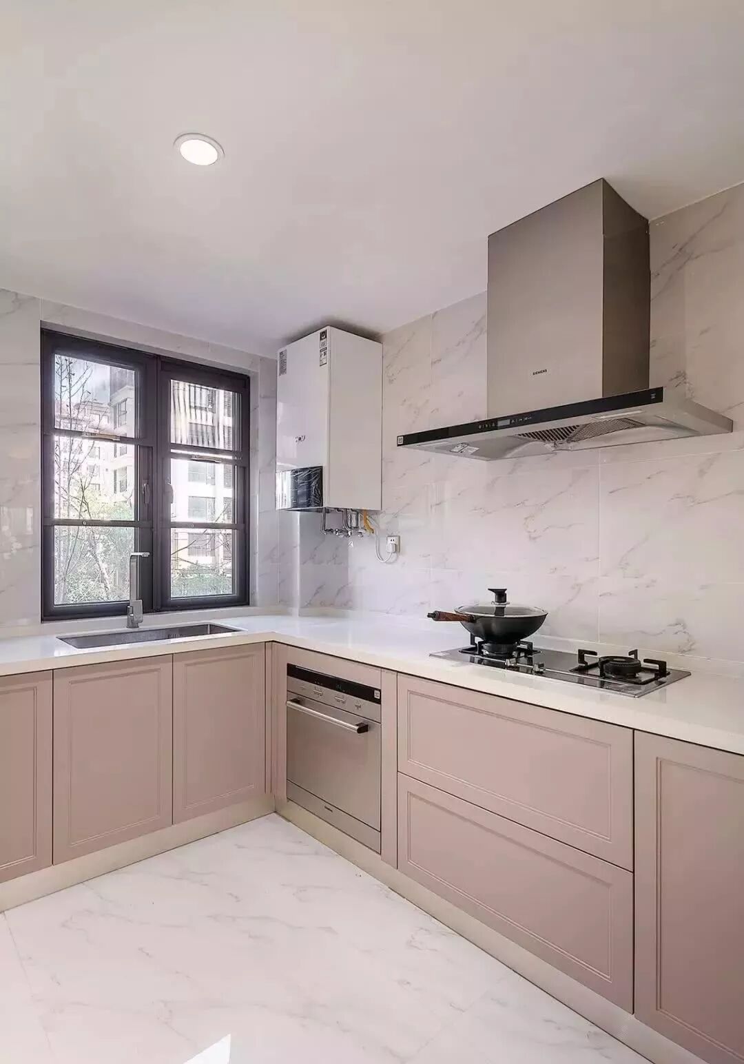 ▲厨房一体定制的柜体,颜色清新时尚,显得更加整洁一致。