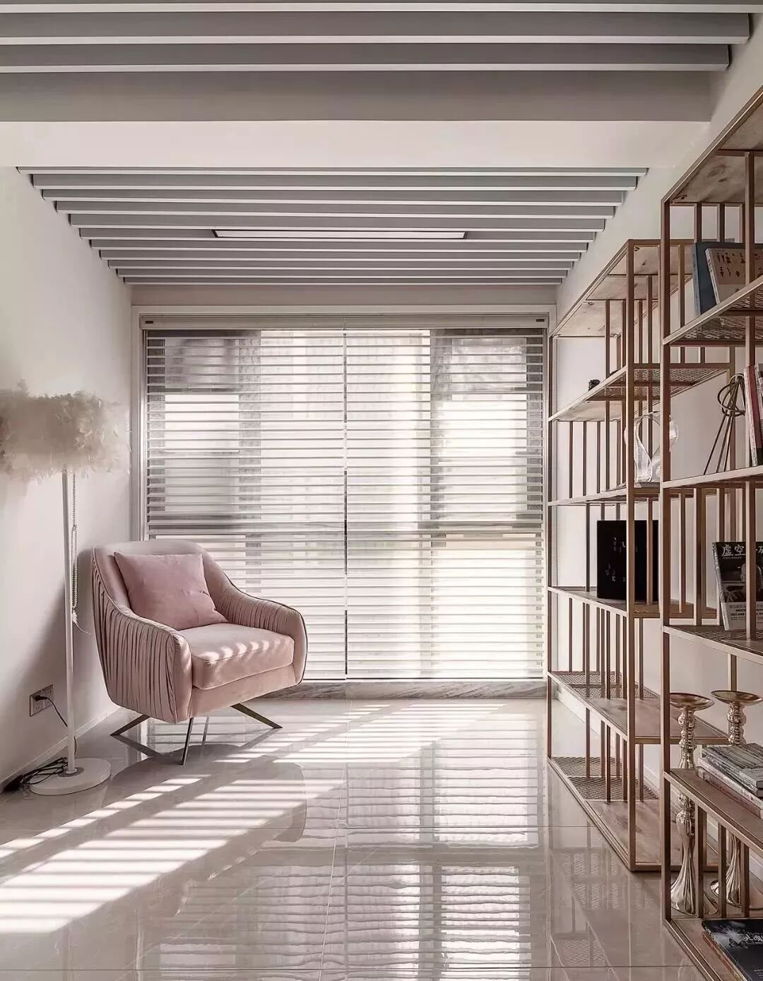 ▲书房与休闲室一墙之隔,休闲室用线性吊顶化解横梁,使用百叶窗帘合理控制光线进入。