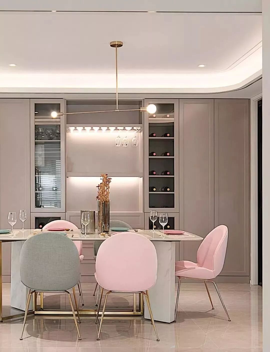 ▲石质餐桌与灰粉色餐椅,一整面墙的餐边柜,既能收纳也能展示之用。