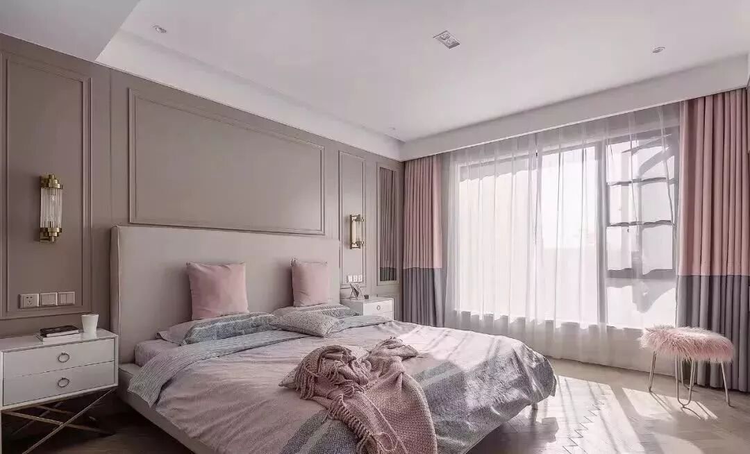 ▲主卧室的床头背景墙精致的线条感,搭配灰粉色调的床品+窗帘,打造温馨睡眠环境。