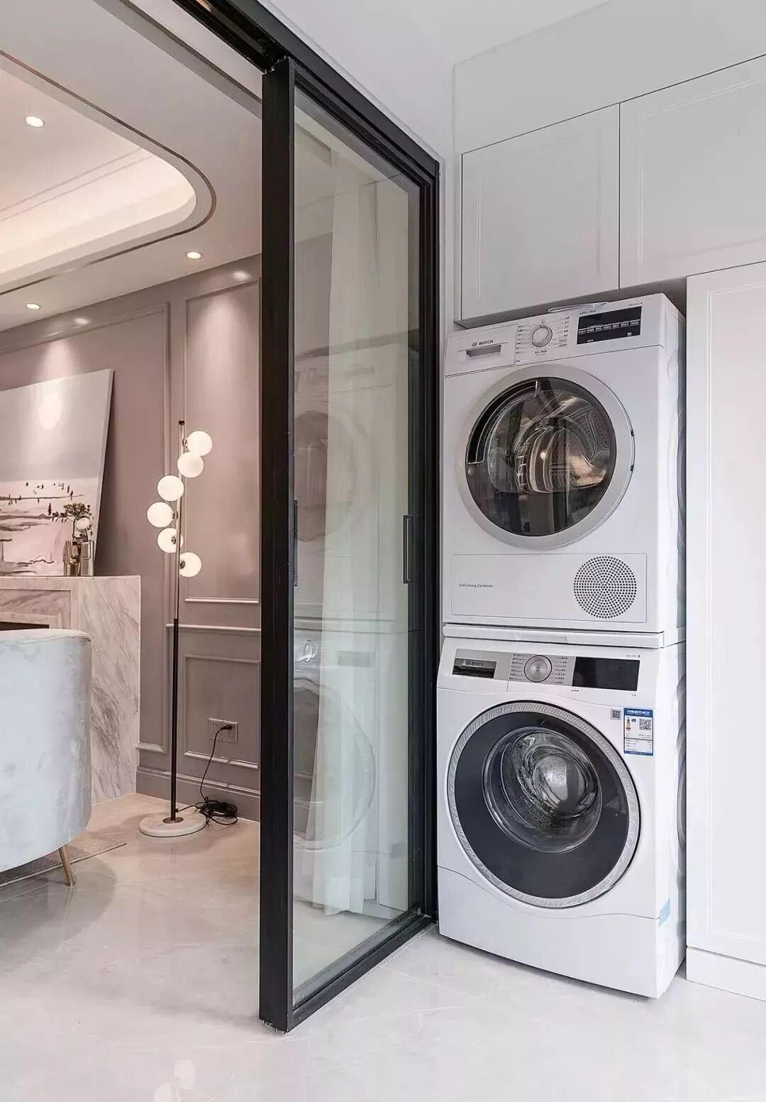 ▲阳台的一侧设计为洗衣区,拖把池、干衣机、洗衣机都嵌入进柜子,看起来更加整洁。