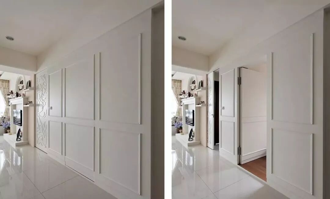 隐藏门也是护墙板中常见的组成部分之一,常用于私密空间或保证背景墙的整体造型不被破坏而常用的处理手段。其特点就是,门扇开启则和普通房门一样,可以通到另一所房间;但门扇关闭之时,外观与其他墙板几乎无有差异,让人误认为它之是普通的墙板之一。
