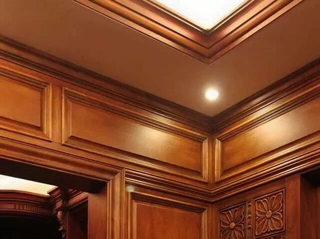 护墙板的主要构成部分之一是造型饰面,也是占据整个墙板比重最大的组成部分。造型饰面主要由左右边梃、上下码头(根据墙板长度适当也会增加中码头和中梃)、造型芯板和压线四部分构成。根据不同风格的变化,饰面造型也随之变化。常见的饰面上还会配有雕花,有的是在边梃码头上,有的是在芯板上,有的是在压线上,而有的也可以同一组雕花分别在这三者之上,形成一个整体效果。雕花的位置和大小,大多根据墙板本身的造型和大小而定,并没有特定的标准可言。