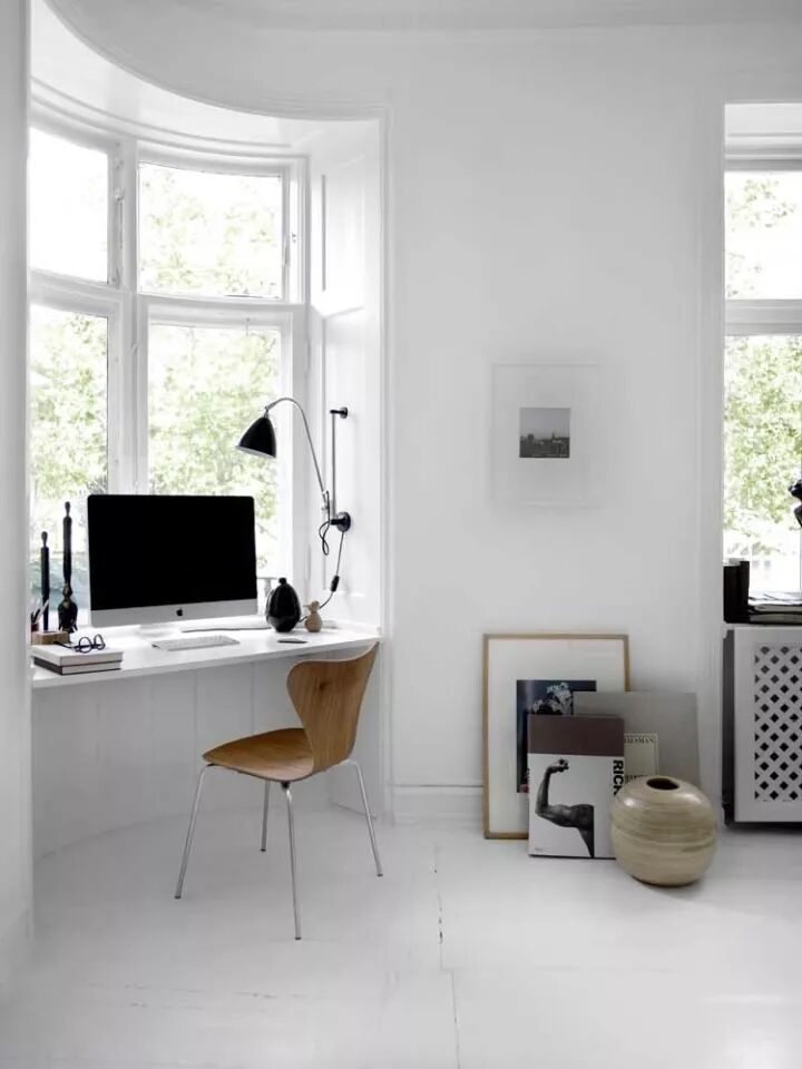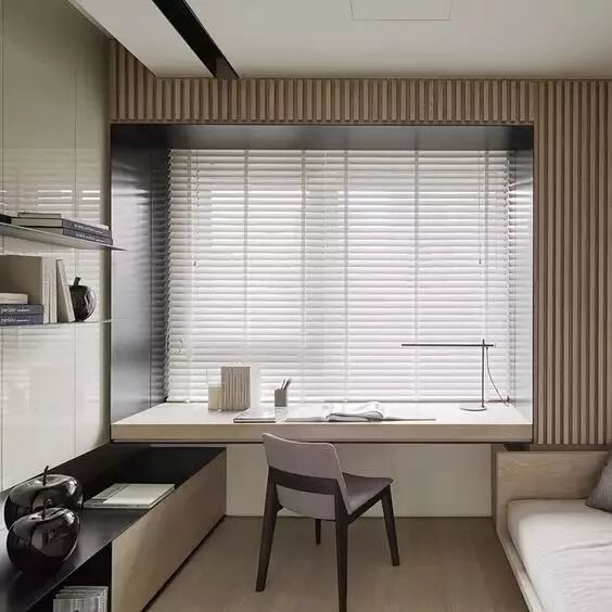 将飘窗打造成工作区,依着窗沿打造三面式桌面设计,有再多杂物也不怕。但值得注意的是,飘窗式工作区桌面进深一定要足够,如果腿没有办法妥当安置,你就会很想掀桌子。