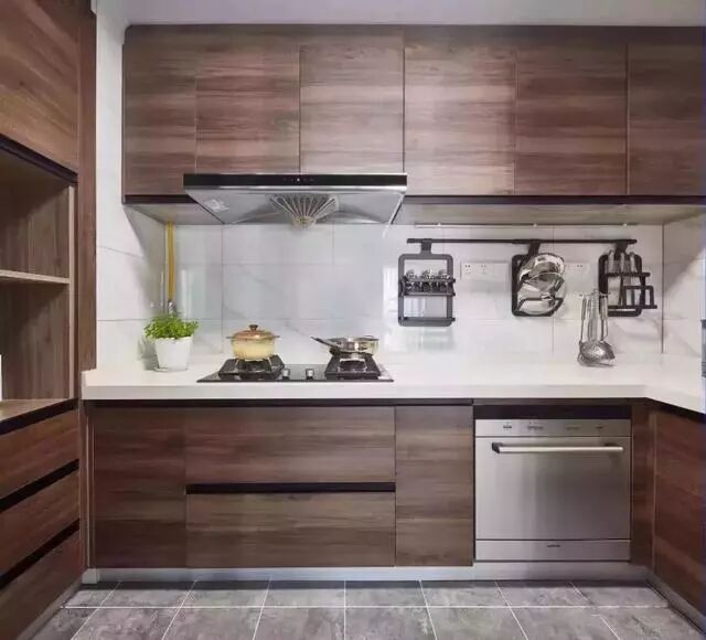 ▲ 灰色系瓷砖搭配定制款木色橱柜,高端大气。