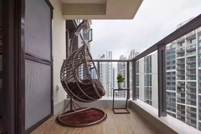 ▲ 阳光面积宽敞,一架藤制吊椅放角落,吊椅里放柔软坐垫,舒适度满分。