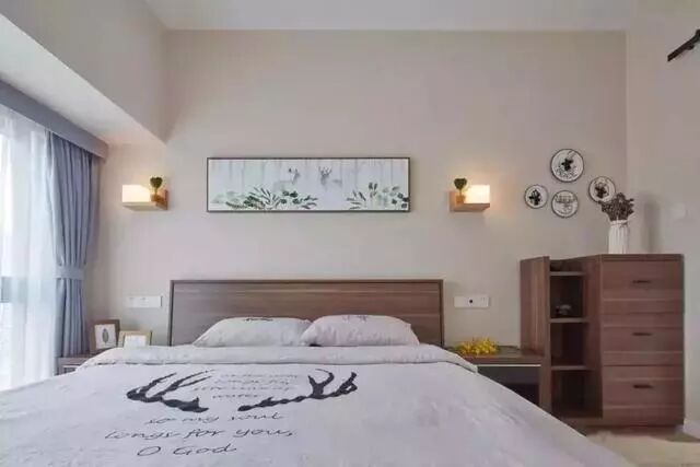 ▲ 床头背景墙上安装对称壁灯与长条意境装饰画,浪漫感十足。