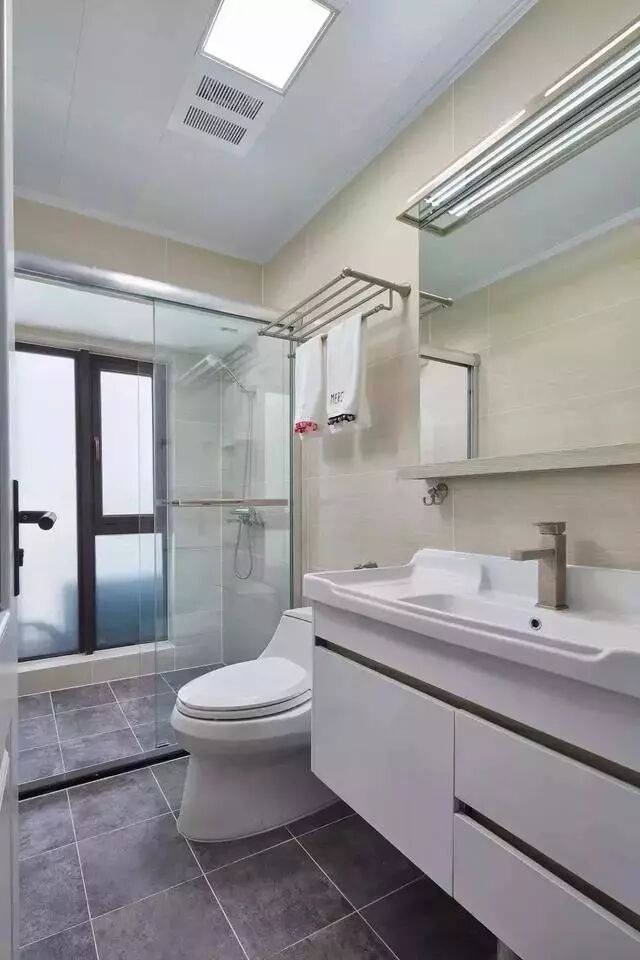 ▲ 悬空浴室柜搭配墙镜,玻璃推拉门让空间做到干湿分区。