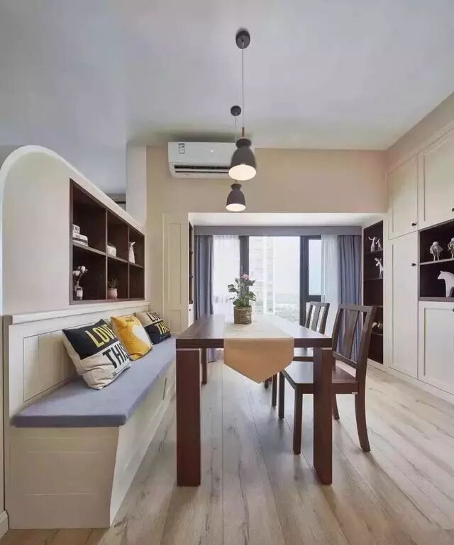 ▲ 实木餐桌椅搭配卡座设计,不仅节省空间,还可以满足更多人用餐时的需求。