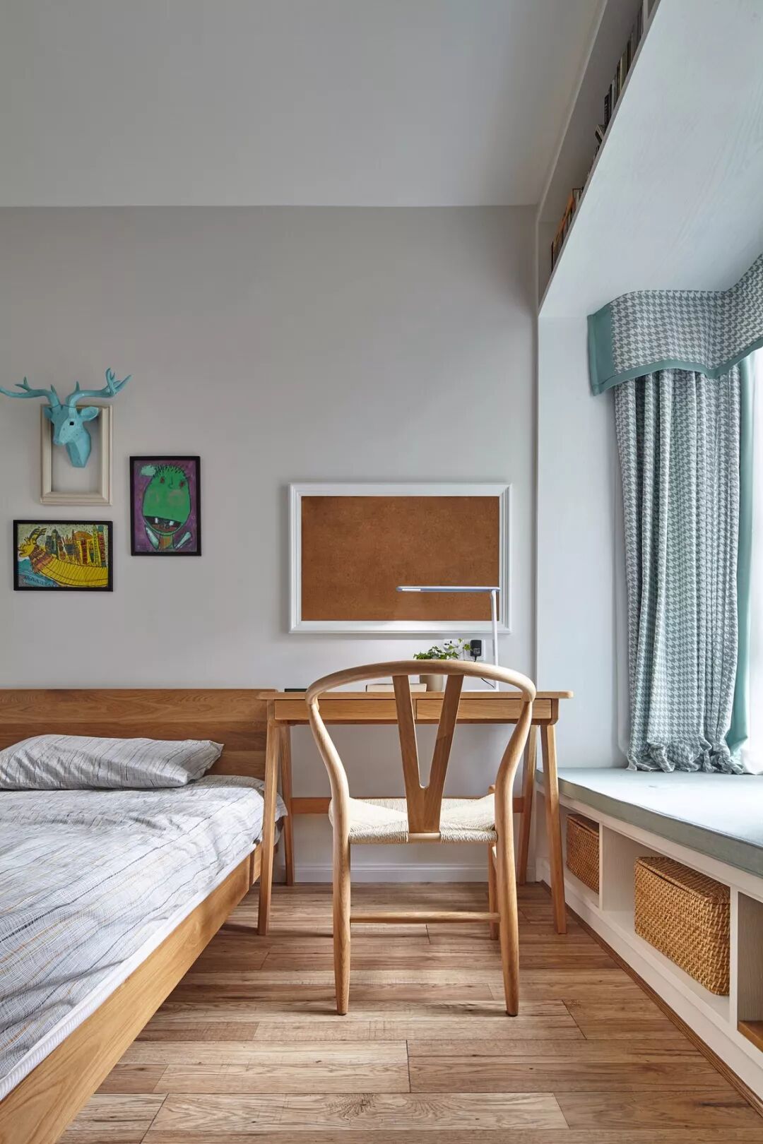 白色的打底空间,原木的韵味儿童房中,设计师别出心裁,利用小主人的原画作作为床头的挂饰,搭配北欧风的鹿头,充分显示了小主人的童趣风。