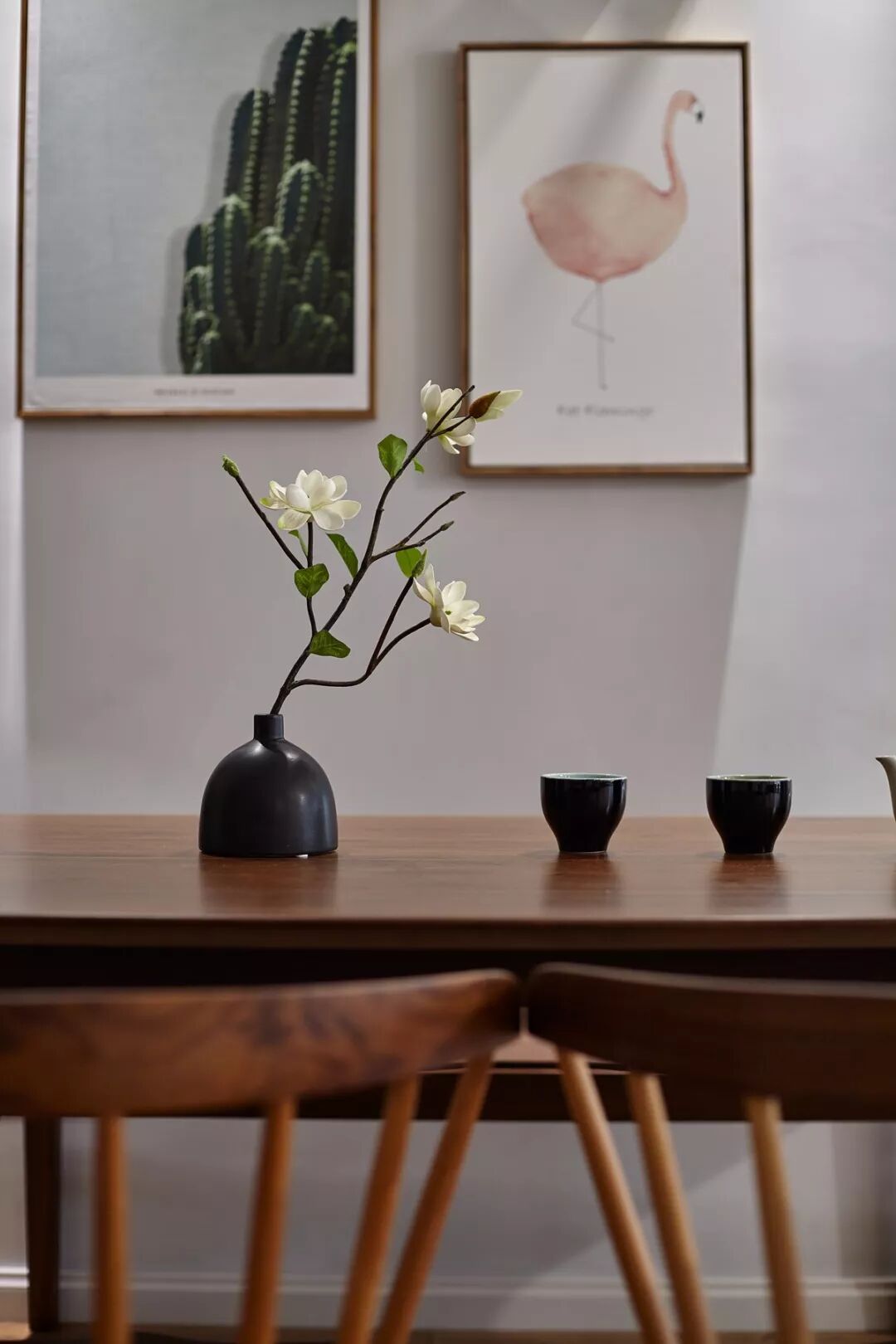 餐厅背景墙的鹿头与红鸟装饰画,结合木质餐桌上的禅意小花枝与一套小茶具,整个空间都显得好自然舒适。