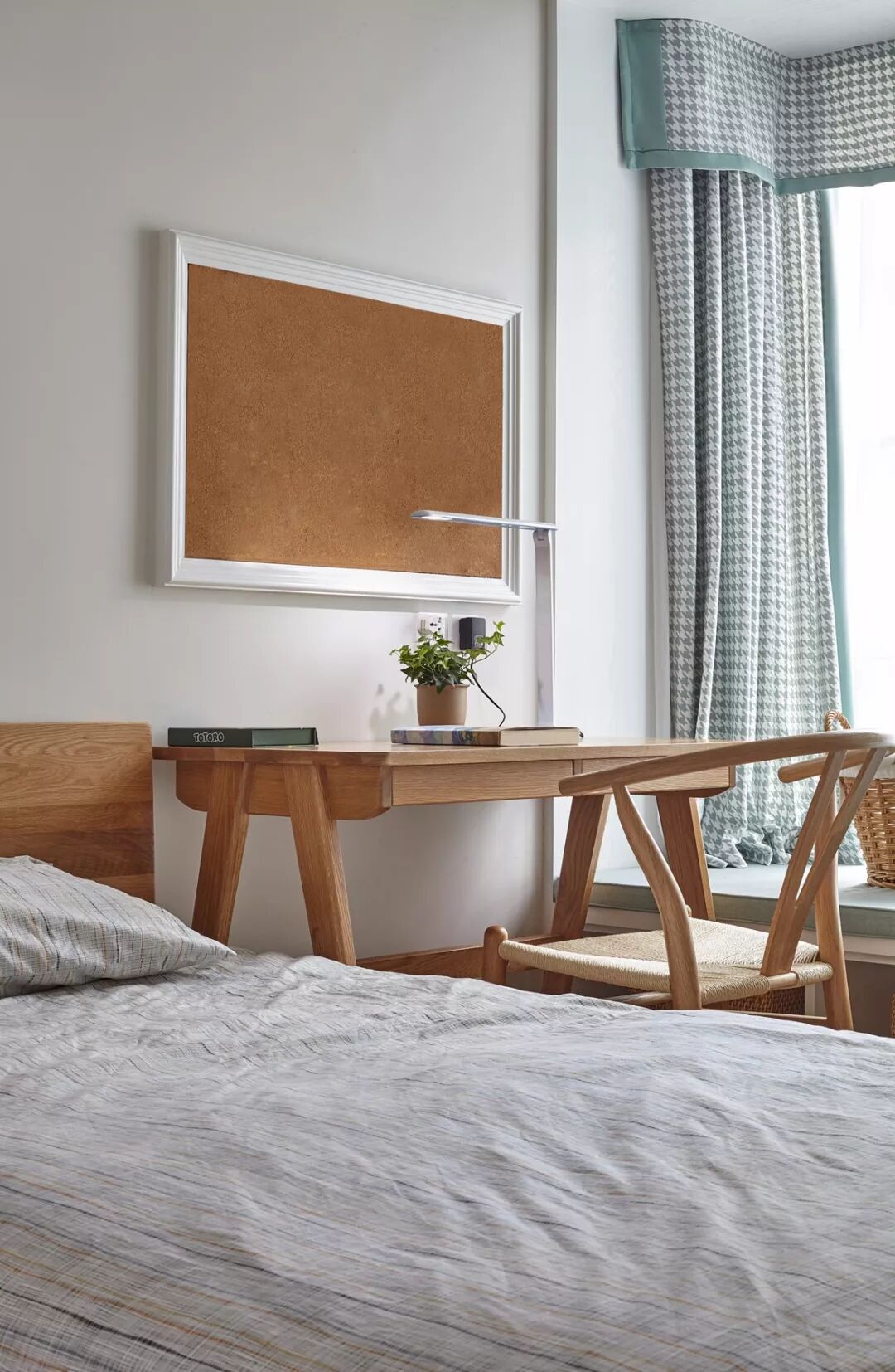 书桌上的墙面以软木板装饰,方便小主人日常学习备忘,更是小主人粘贴成长照片的好设计。