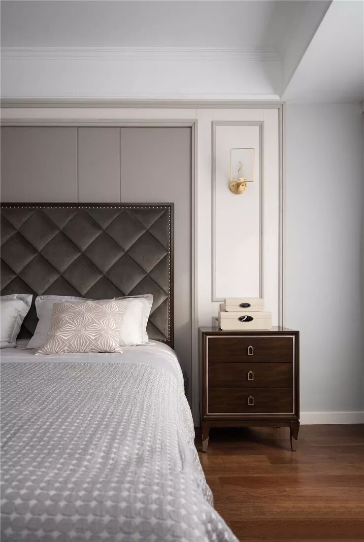 ▲ 高级灰的硬包与线条简洁大气,配以素雅的床品营造出安静舒适的氛围。