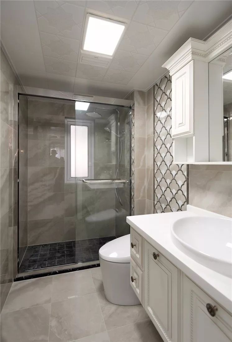 ▲ 卫生间灰白色搭配简洁优雅,局部花砖点缀突出精致感,这就是生活最完美的状态。