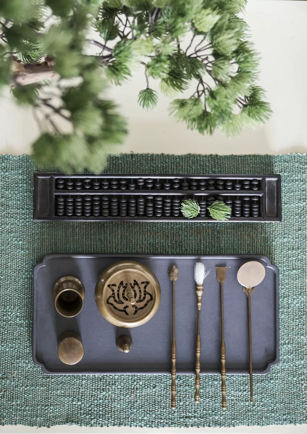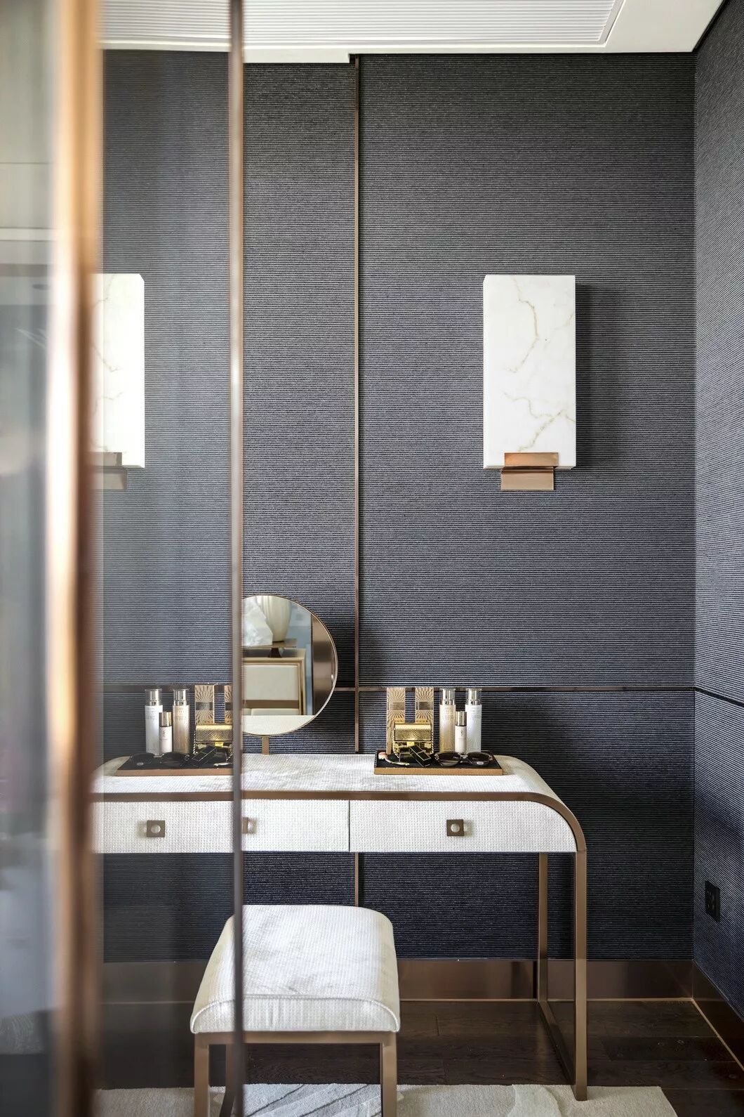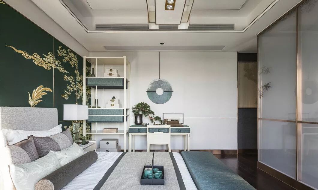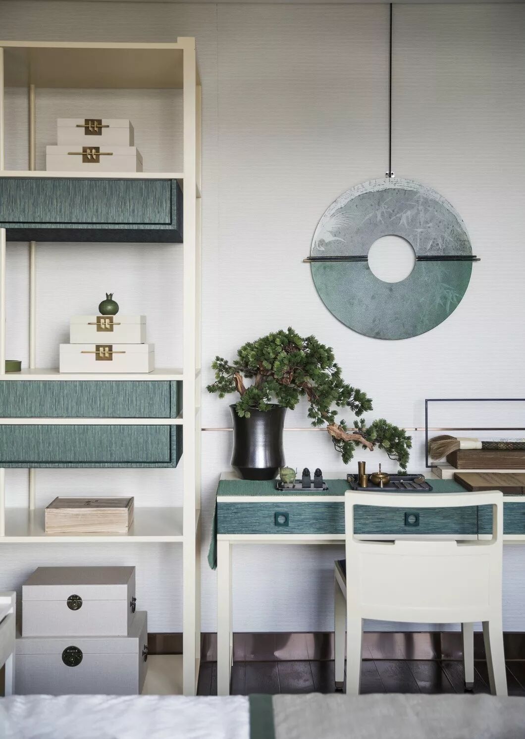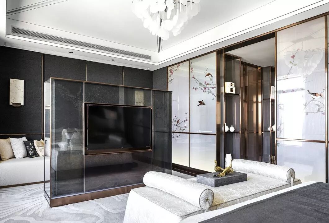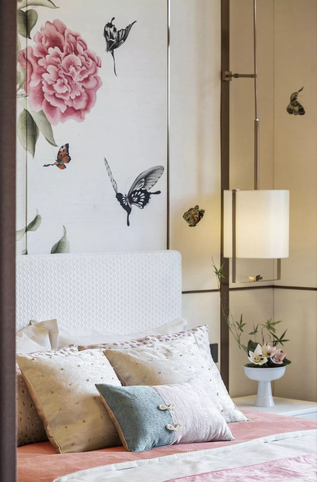 主卧的屏风隔断以玻璃夹画的形式,让空间更加通透的同时赋予空间更深层次的寓意与体验。方寸之间皆为景,在这东方之境融入细腻饱满的人文情怀,描绘内敛淡然的悠远意象。