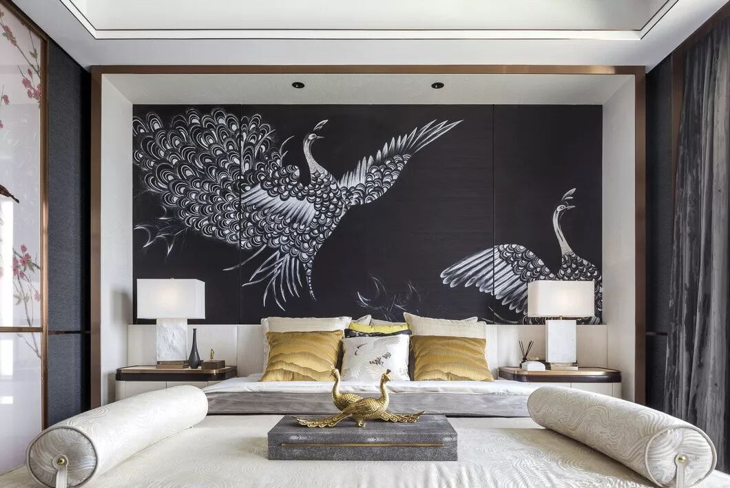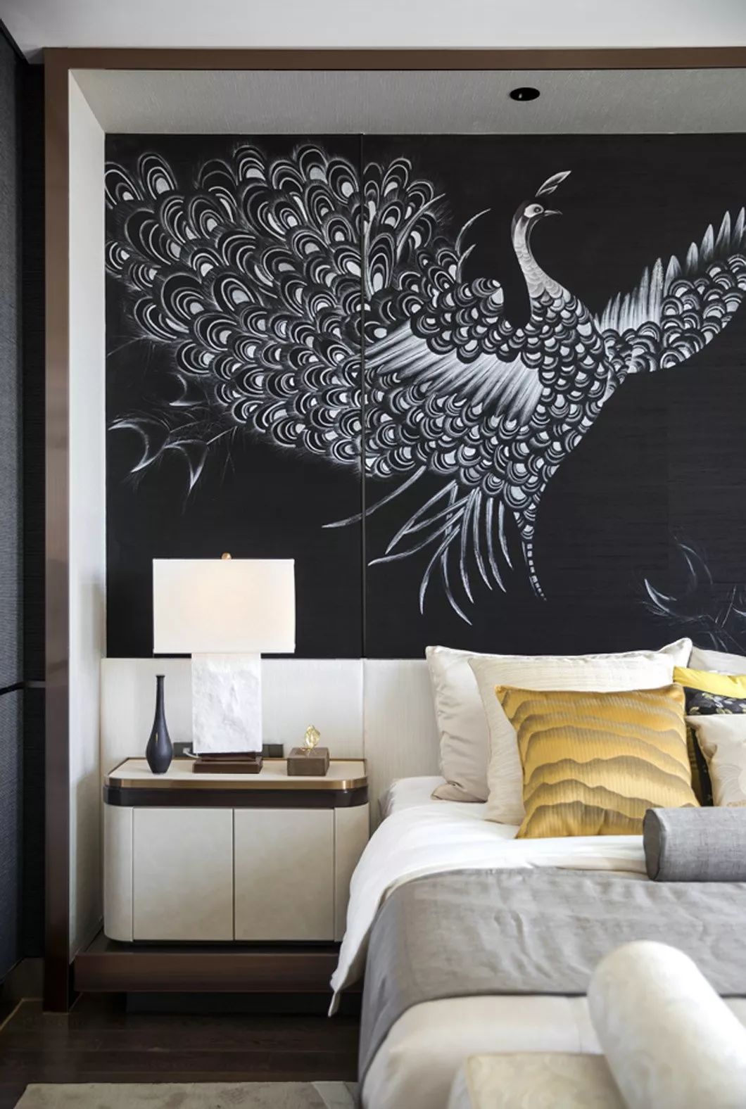 主人房主幅取“仙鶴”之意,換為“鳳凰”之形,融入传统 “苏绣”锦画的工艺,描绘出“凤凰”的恢弘大气,细腻的笔触勾勒出集美与富贵为一体的高贵气质,一束灯光洒落在羽翼之上,闪闪发光的丝线给房间增添了富贵华丽的印象,体现主卧的华丽与尊贵。