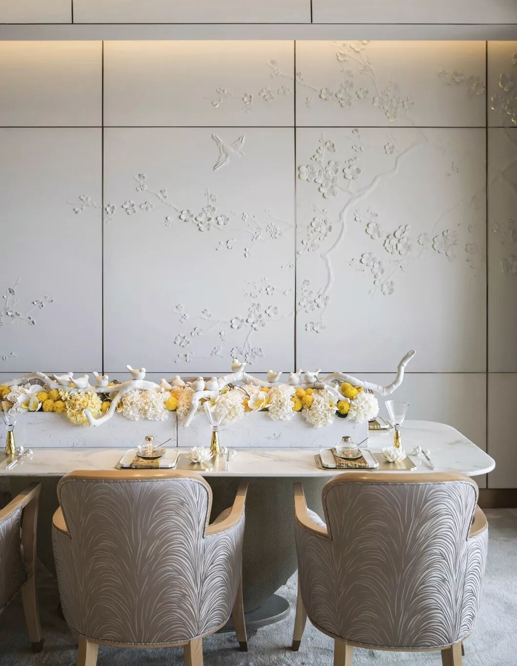 餐厅背景以代表东方文化内涵的梅花为元素,圆月梅花,满载合意。设计师运用皮雕工艺将其演绎呈现,背部的蝴蝶刺绣栩栩如生,仿佛被屋中美景吸引,留恋于此。