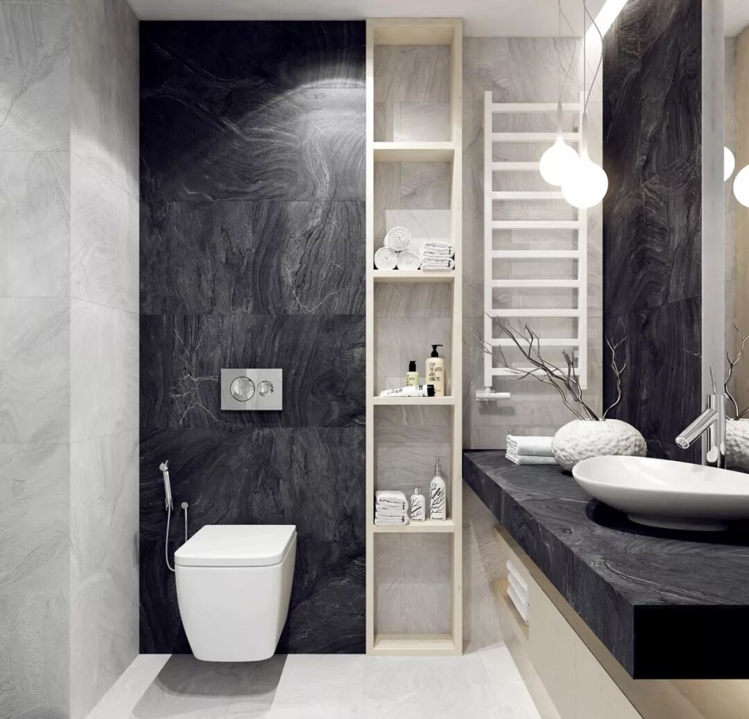 壁龛是过去宗教里用来供奉佛像的凹入墙面的空间,如今被广泛用在装修设计中。卫生间可以利用不规则的局部空间或者包管时设计壁龛,它不占建筑面积,美观的同时还能用来收纳。