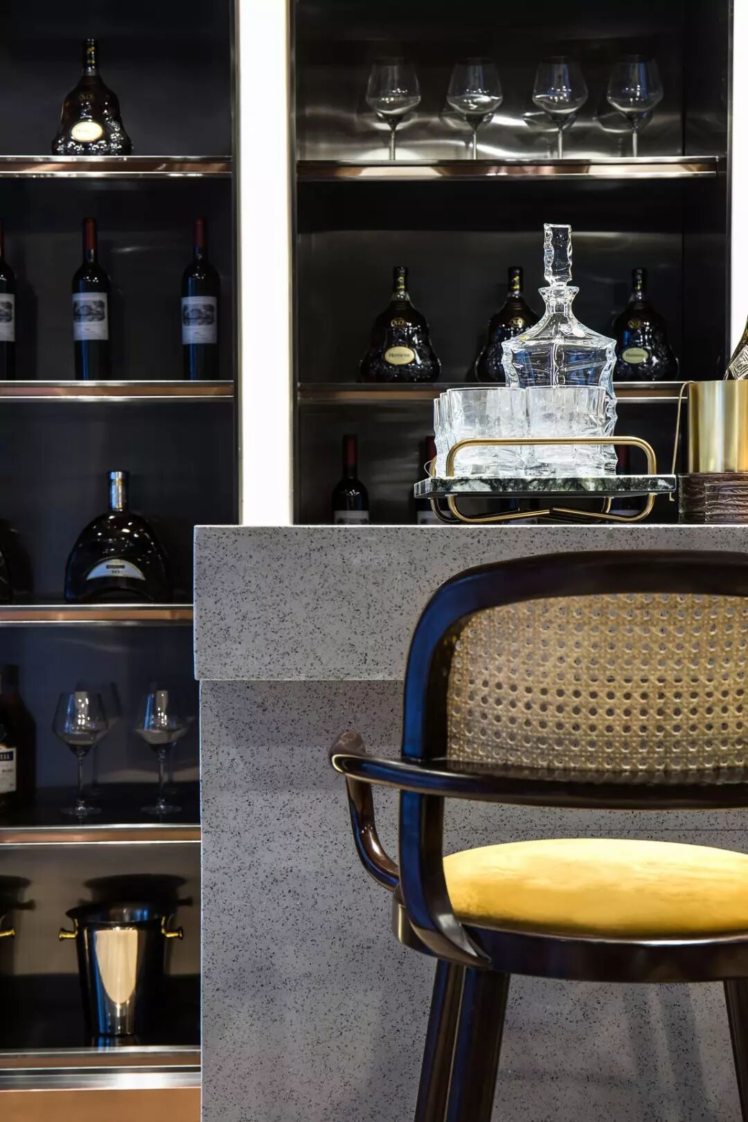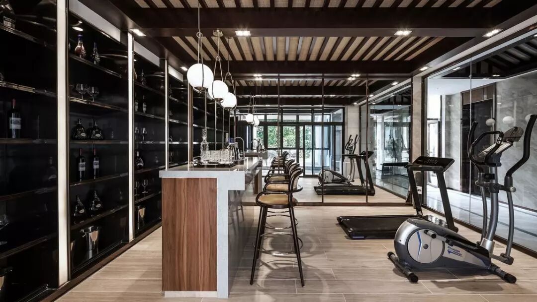 结合了吧台和健身空间的休闲厅,是一个有趣的创举。镜面形成空间拓展的视觉魔术之外,更有实用性的健身用途,呈现理性的美学。