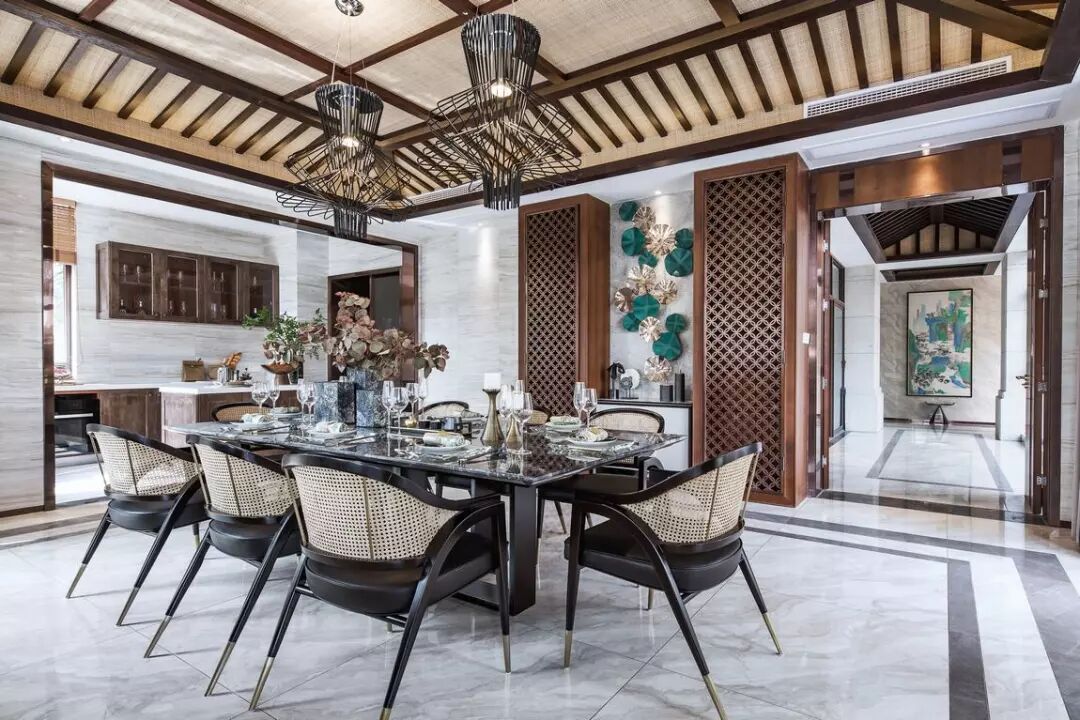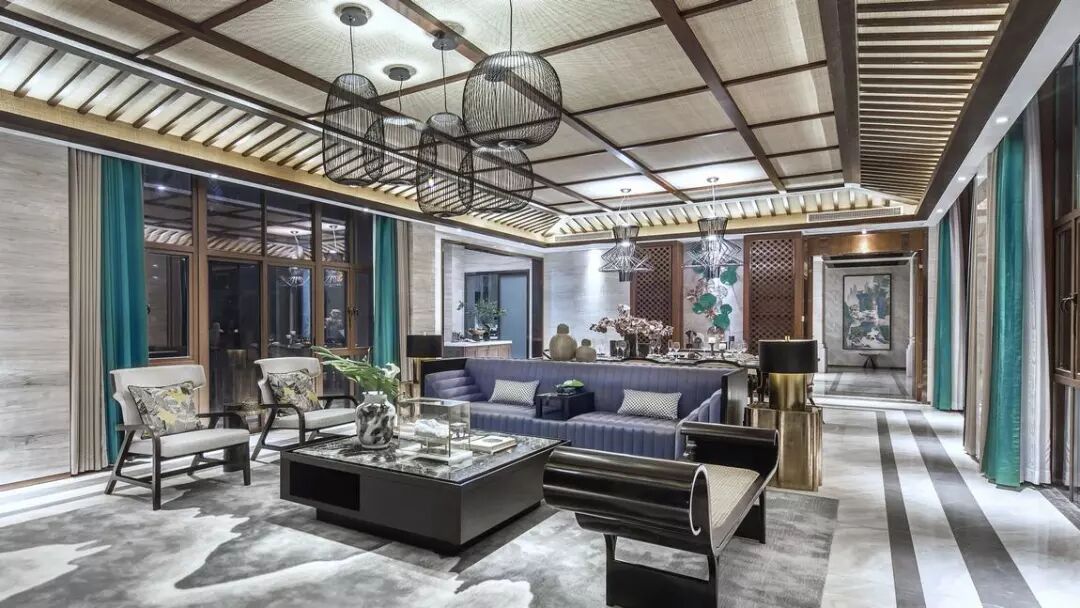 有别于简洁为主的户外空间,室内设计采用了经过淬炼和重新演绎的新中式风格,华美又不失儒雅。