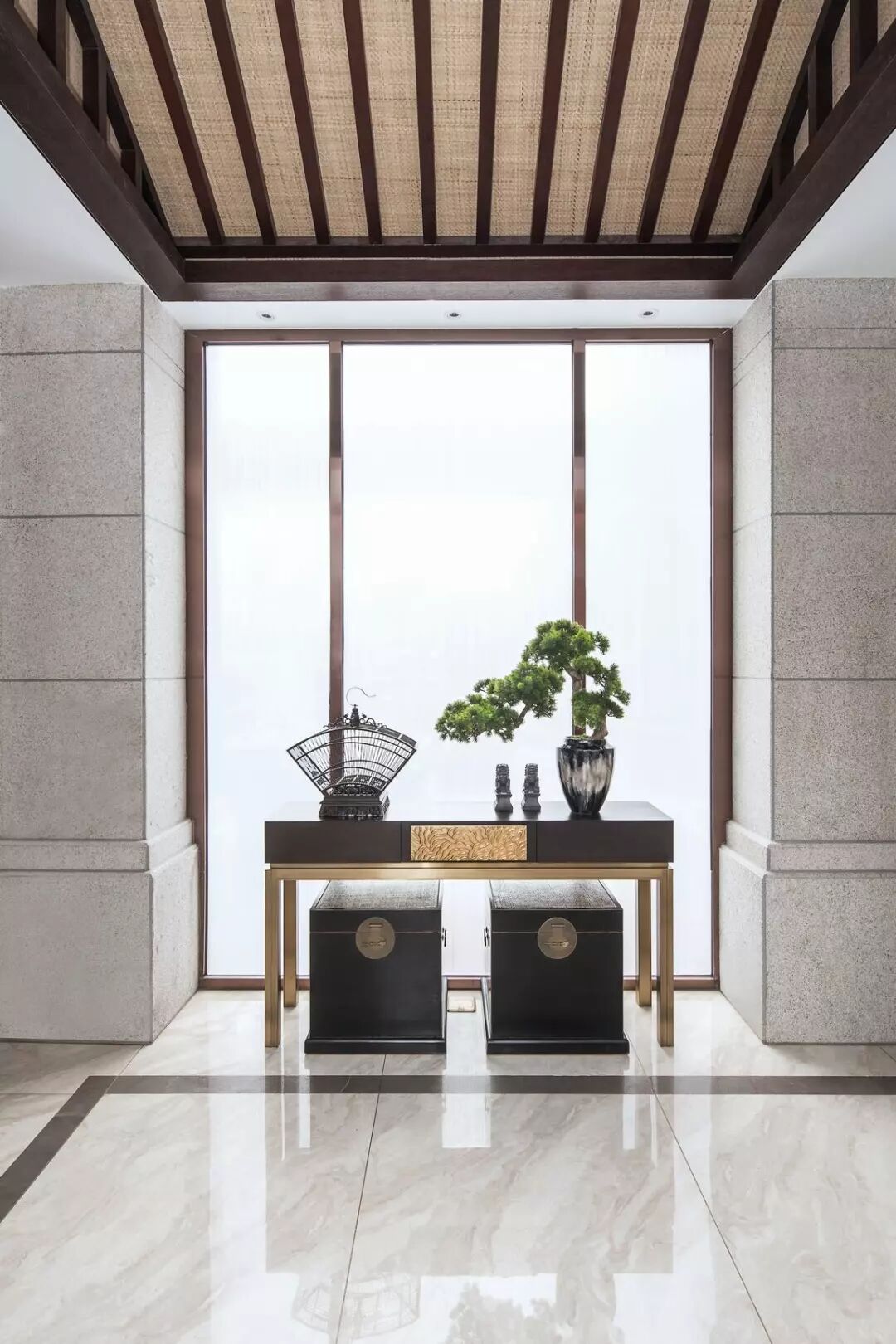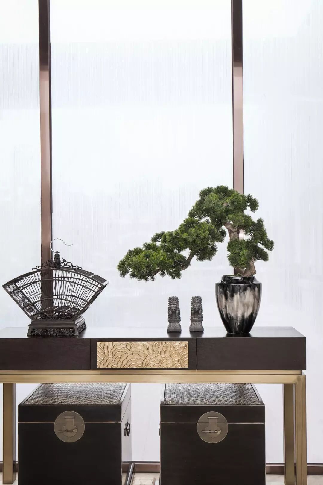 古风案几、鸟笼、箱匣、松树、石狮子……经典中式意象貌似不经意地点缀在空间各个角落里,与现代金属材料、大片落地玻璃形成有趣的碰撞。